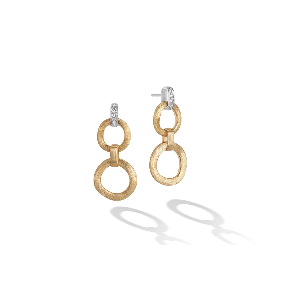 These Marco Bicego Jaipur Double Drop Earrings are made of 18K yellow gold. These dangle earrings each feature two open circle motifs which are connected with an oval link. These post-back earrings are decorated with 0.08 carats of diamonds. These earrings are approximately 1.55 inches long.