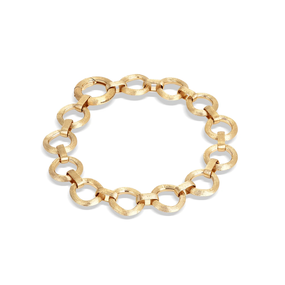This Marco Bicego Jaipur Flat Link Bracelet is made of 18K yellow gold. The bracelet measures approximately 7.25 inches long.