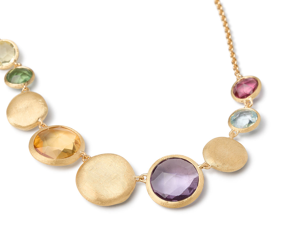 This Marco Bicego Jaipur Color necklace is made of 18K yellow gold. The necklace is set with mixed multicolor gemstones and is approximately 16.5 inches long.