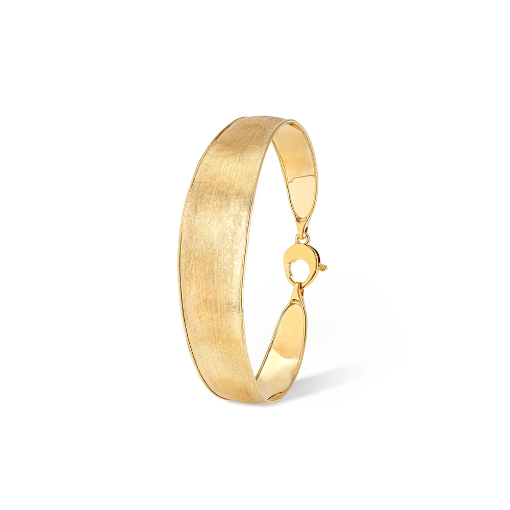 This Marco Bicego Lunaria Medium Width Bangle is made of 18K yellow gold. This gold cuff bracelet is approximately 2.25 inches wide and includes a lobster clasp.