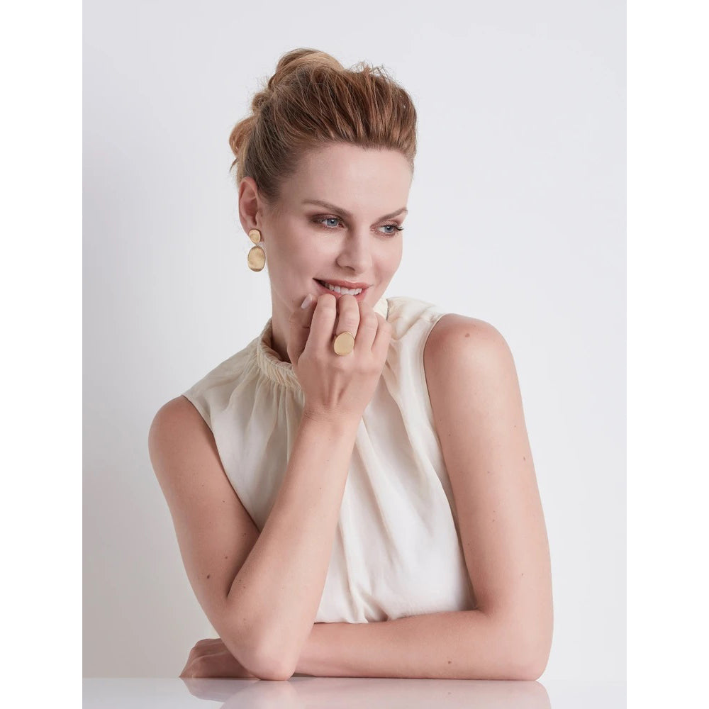 These Marco Bicego Lunaria Small Double Drop Earrings are made of hand hammered and engraved 18K yellow gold. The earrings are approximately 1.73 inches long.