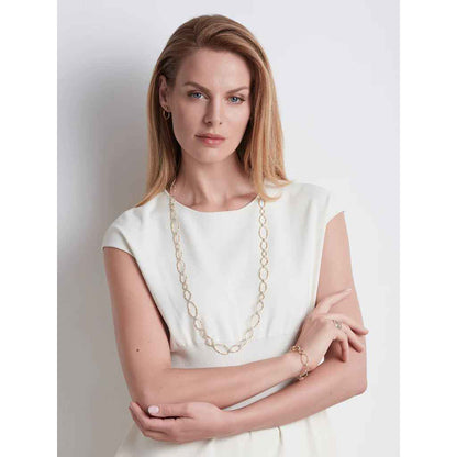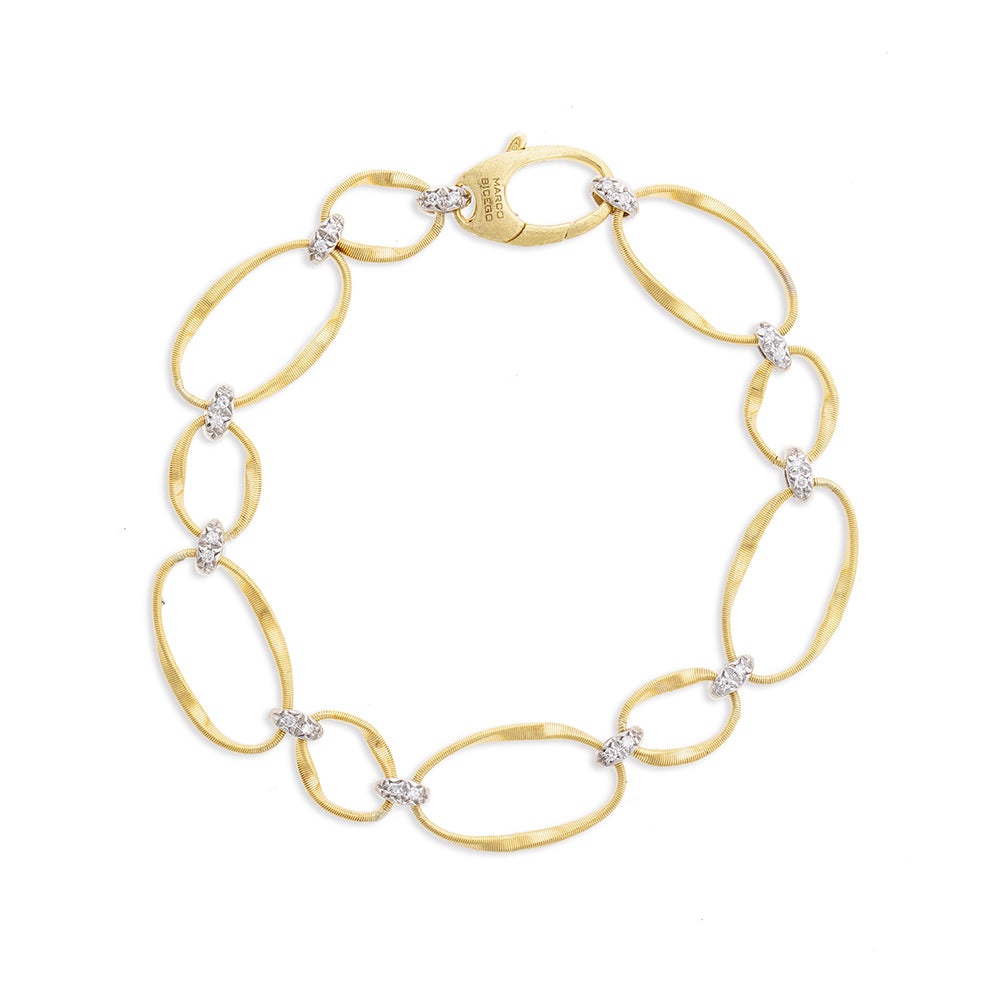 This Marco Bicego Marrakech Onde flat link bracelet is made of 18K yellow gold coiled links joined by white gold links set with diamonds. The total diamond weight of this bracelet is 0.18 carats.