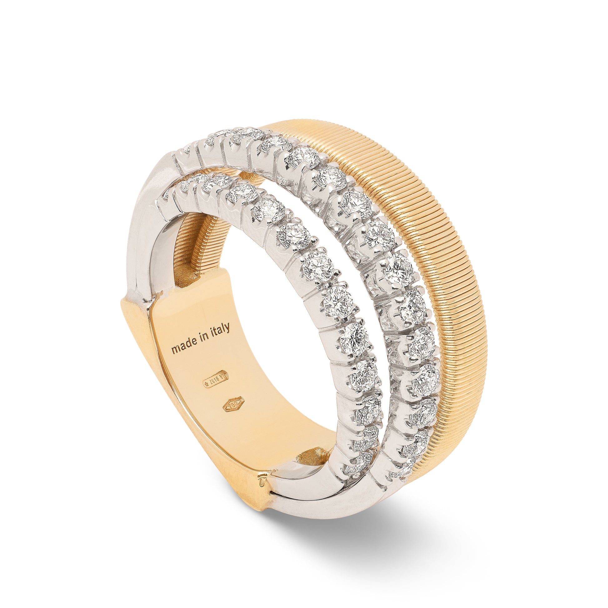 This Marco Bicego Masai coil ring is crafted in 18K yellow and white gold. It features two pave diamond bands set with 0.70 carats of diamonds.