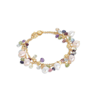 This Marco Bicego Paradise double strand bracelet is made of 18K yellow gold. The bracelet has two strands set with pearls and mixed gemstones. It measures approximately 7.25 inches long. Multicolor gemstones may vary in color.
