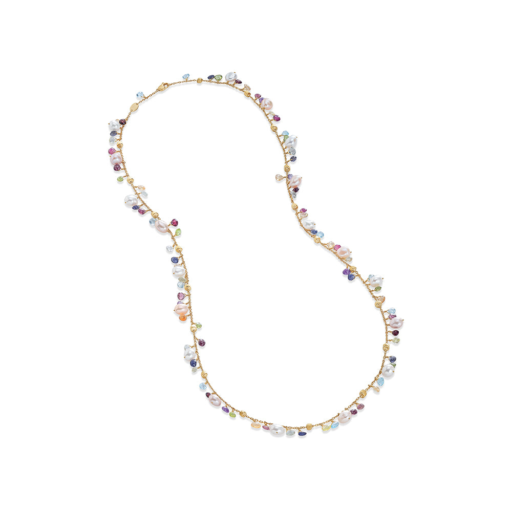 This Marco Bicego Paradise medium necklace is made of 18K yellow gold. The necklace is set with pearls and mixed multicolor gemstones. It measures approximately 29 inches long. Multicolor gemstones may vary in color.
