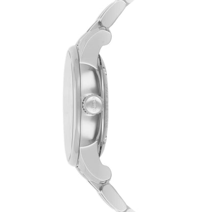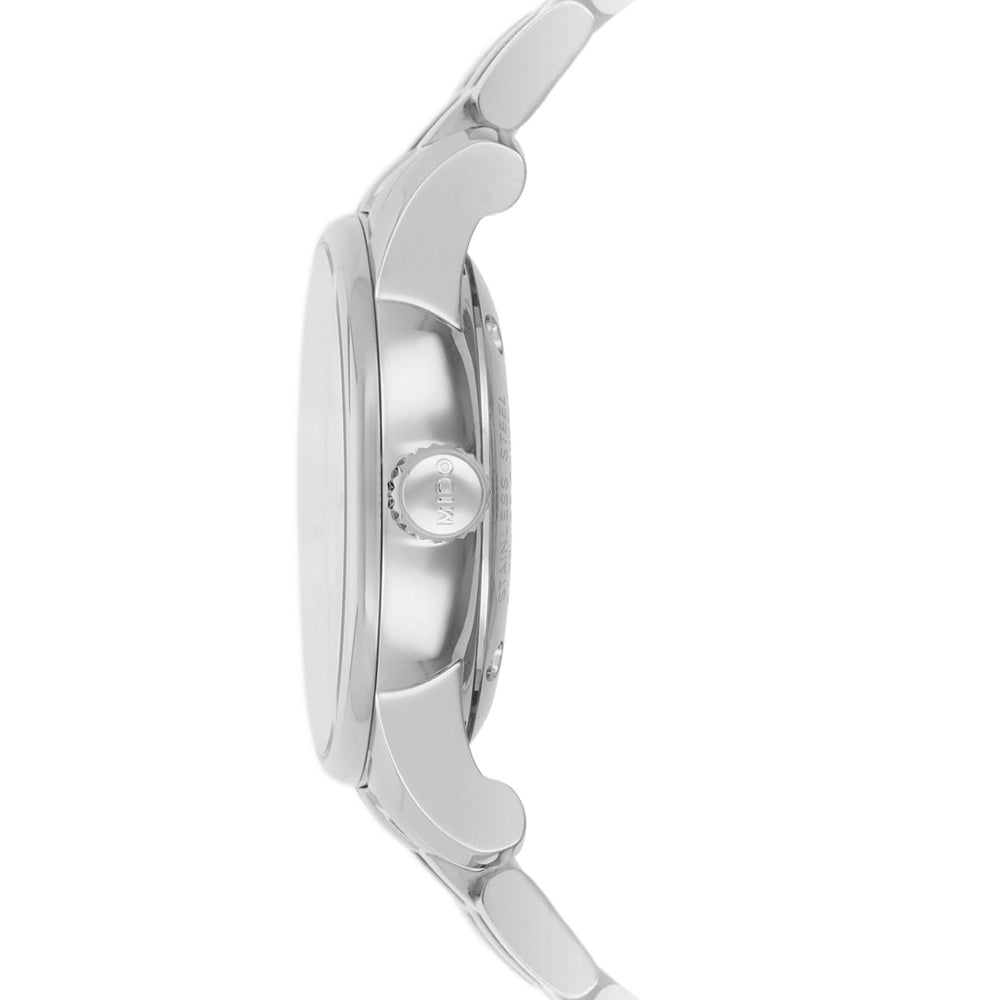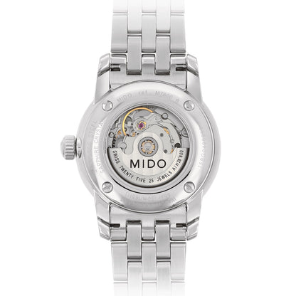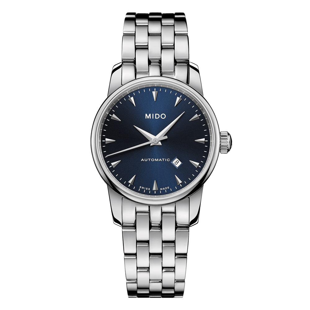 The Mido Baroncelli Midnight Blue Lady has an automatic movement contained within a 29mm stainless steel case. The blue dial reveals a date window and is covered by sapphire crystal. The stainless steel bracelet has a deployant clasp. Water resistant to 50 meters.
