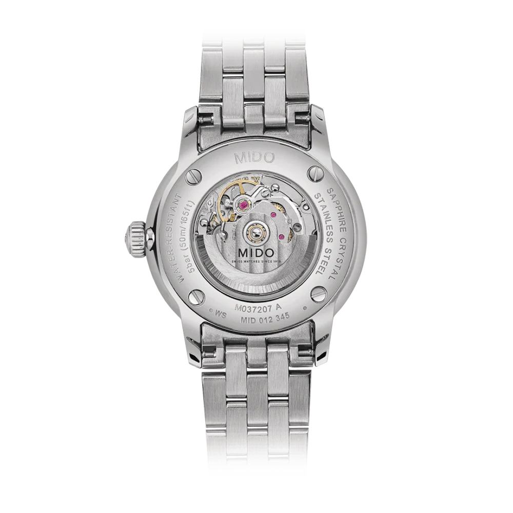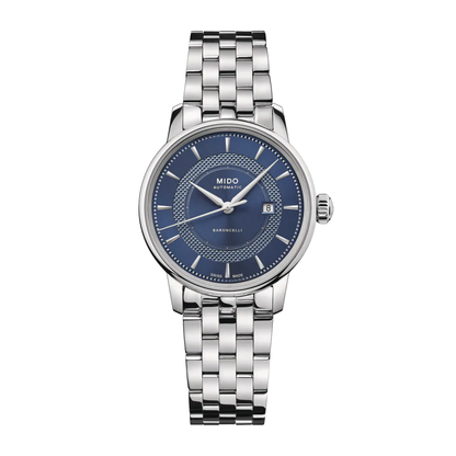 The Mido Baroncelli Signature watch is powered by an automatic movement inside of a 30mm stainless steel case. The blue dial features a date display and is covered by sapphire crystal. The stainless steel bracelet includes a folding clasp. Water resistant to 50 meters.