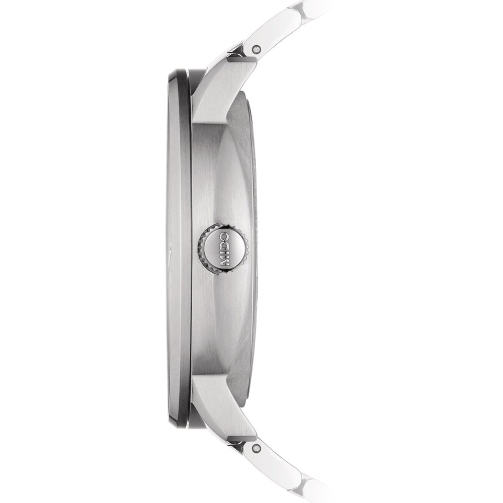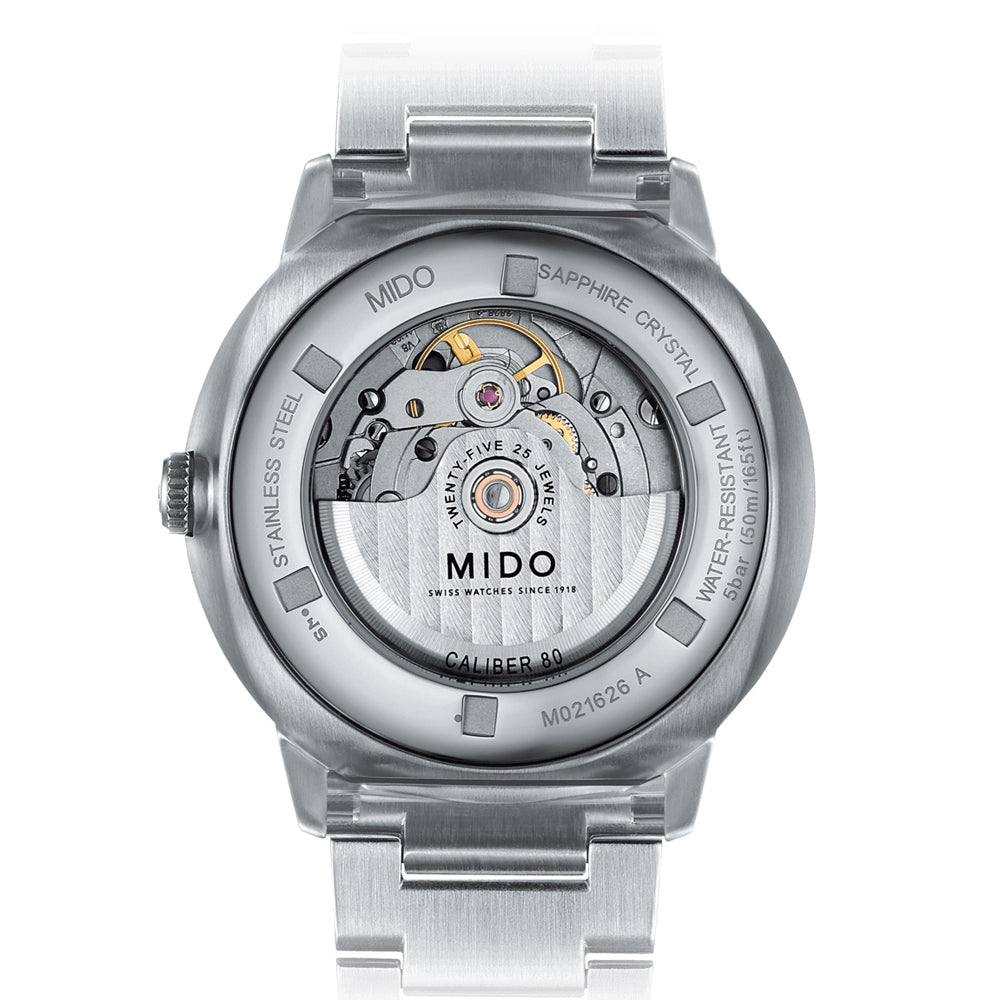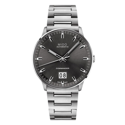 The Mido Commander Big Date is powered by an automatic movement in a 42mm stainless steel case. The anthracite gray dial reveals a large date window at the six o'clock position. It is protected by sapphire crystal. The stainless steel bracelet leads to a deployant clasp. Water resistant to 50 meters.