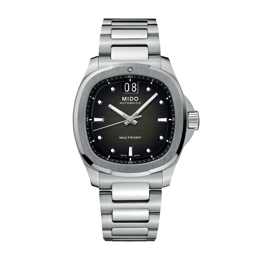 The Mido Multifort TV Big Date watch is powered by an automatic movement within a 39.20mm x 40.00mm stainless steel case. The gray dial features a Big Date function. It is protected by sapphire crystal. The stainless steel bracelet leads to a deployant clasp. Water resistant to 100 meters.