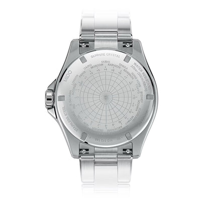 The Mido Ocean Star GMT special edition watch is powered by an automatic movement inside of a 44mm stainless steel case with a rotating blue ceramic bezel. The blue dial reveals a date window and GMT function. It is covered by sapphire crystal. The stainless steel bracelet leads to a deployant clasp. An additional red, white, and blue fabric strap with tang buckle is included. Water resistant to 200 meters.