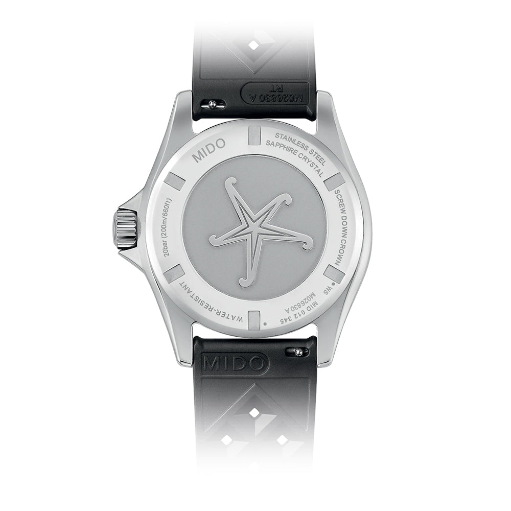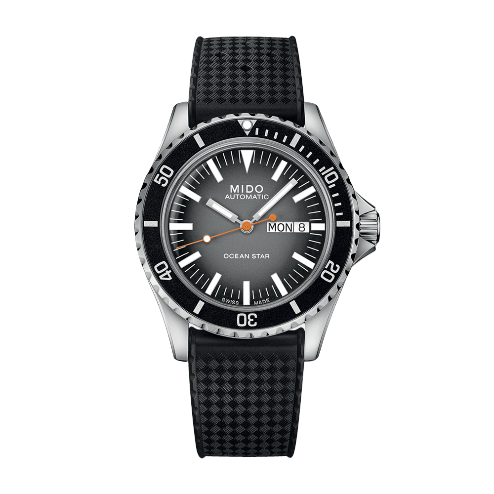 The Mido Ocean Star Tribute watch has an automatic movement contained within a 40.50mm stainless steel case with a black rotating bezel. The gray gradient dial has a day and date window at 3 o'clock. It is protected by sapphire crystal. The black rubber strap is secured by a pin buckle. Water resistant to 200 meters.