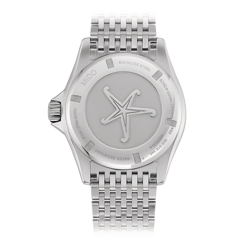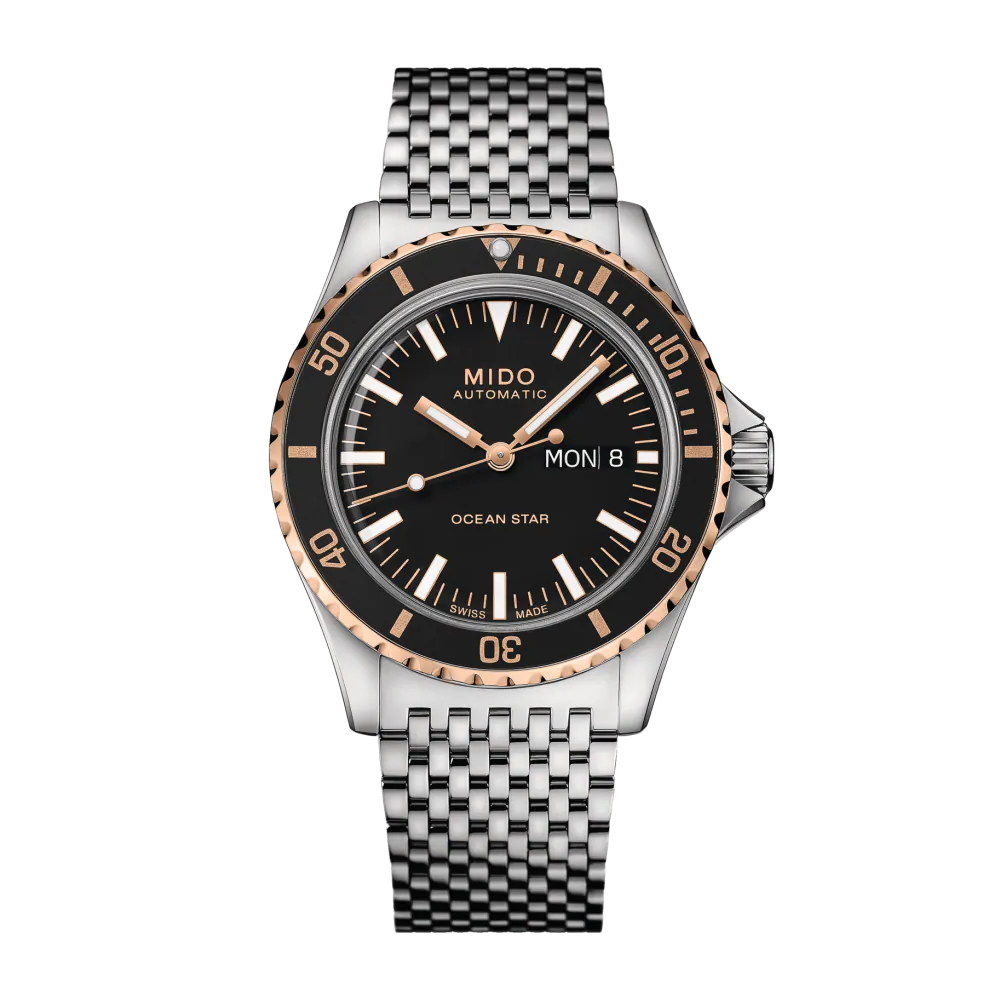 The Mido Ocean Star Tribute watch is powered by an automatic movement in a 40.50mm stainless steel and rose gold PVD-coated steel case with a black rotating bezel. The black dial showcases a day of the week and date display. It is covered by sapphire crystal. The stainless steel bracelet has a deployant buckle. Water resistant to 200 meters.