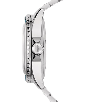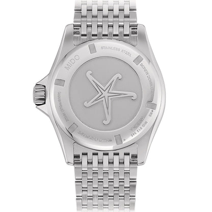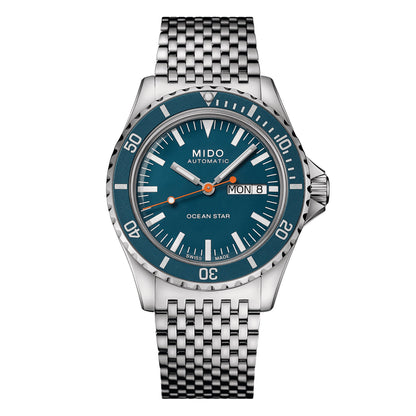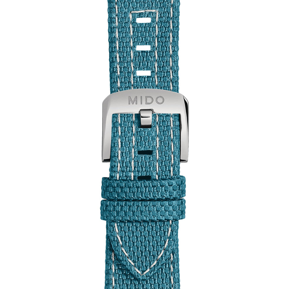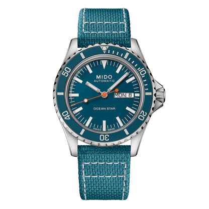 The Mido Ocean Star Tribute is powered by an automatic movement contained within a 40.50mm stainless steel case with a blue ceramic bezel. The blue dial showcases a day of the week and date display. It is covered by sapphire crystal. This watch includes both a stainless steel bracelet and a blue fabric strap. Water resistant to 200 meters.