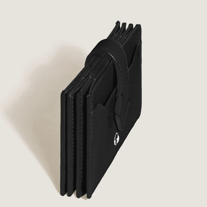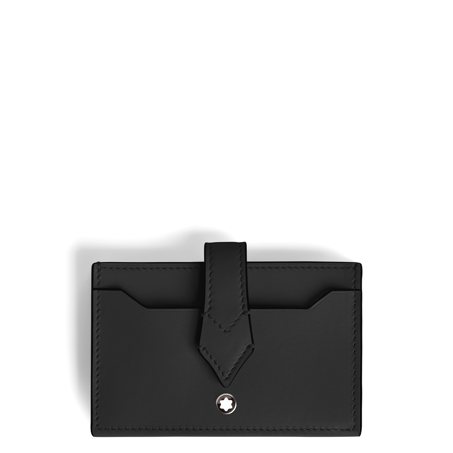 The Montblanc Meisterstück Card Holder is made of sleek black leather with space for up to 5 credit cards. It is secured by a nib-shaped press-button closure. It measures approximately 3.94 x 5.91 x 2.56 inches.