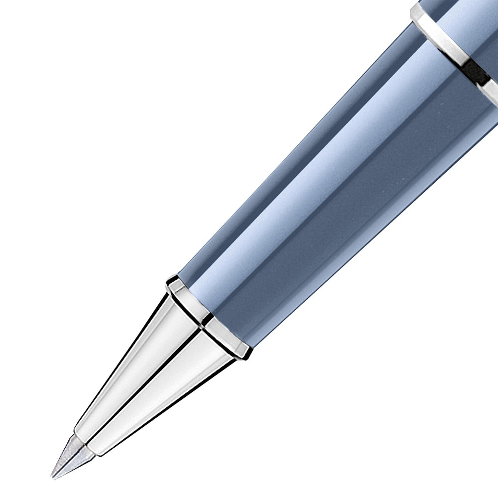 The Montblanc Meisterstuck Glacier Doué rollerball pen draws inspiration from the glaciers found on the Mont Blanc mountain. The pen barrel is crafted in blue precious resin. It is accented by platinum plated fittings and pen cap. The cap of the pen is engraved to resemble ice crystals.
