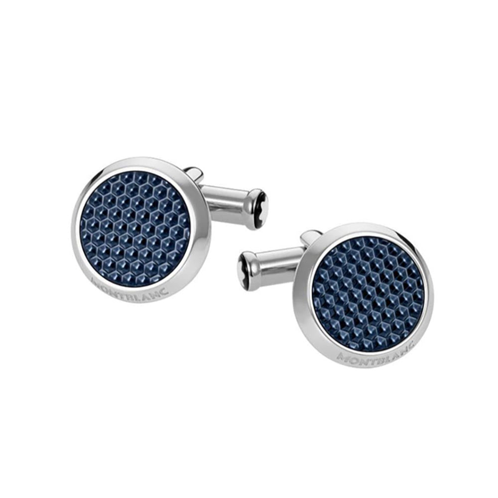 These Montblanc Meisterstuck cufflinks are made of stainless steel. These round cufflinks feature a geometric pattern blue lacquer inlay.