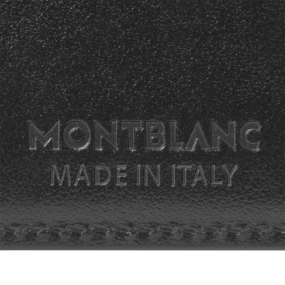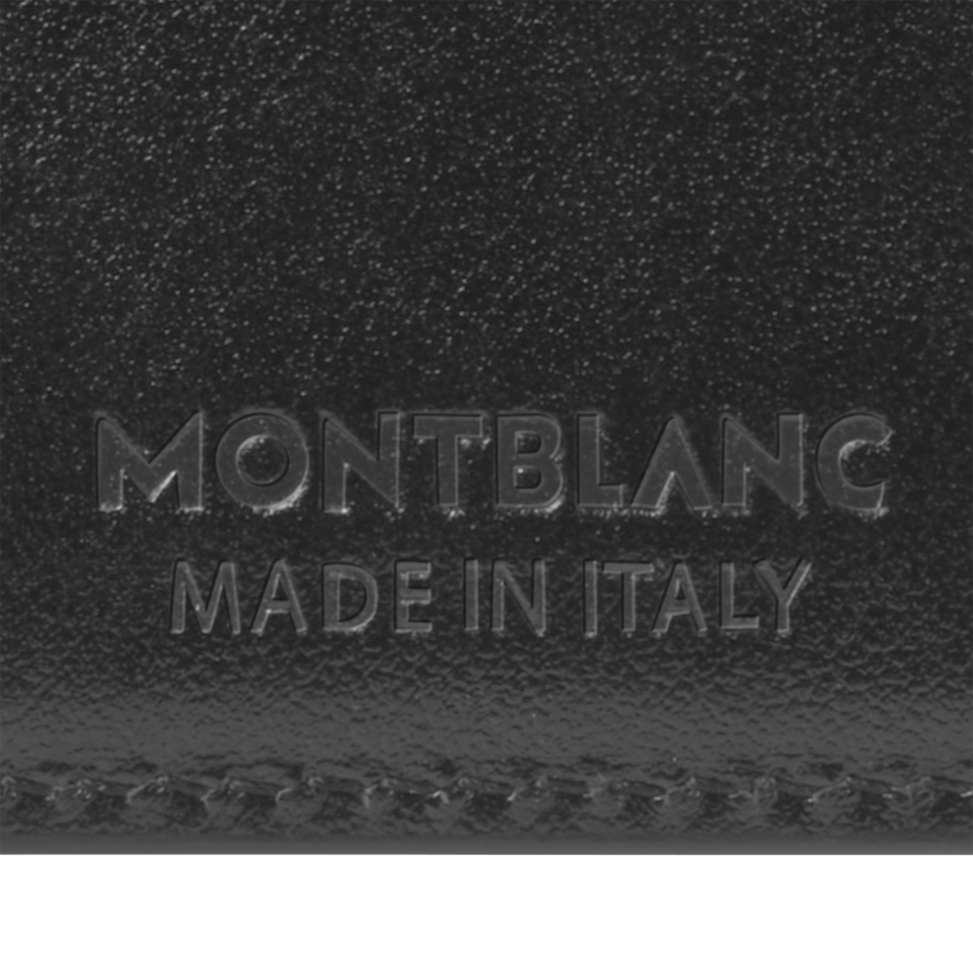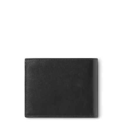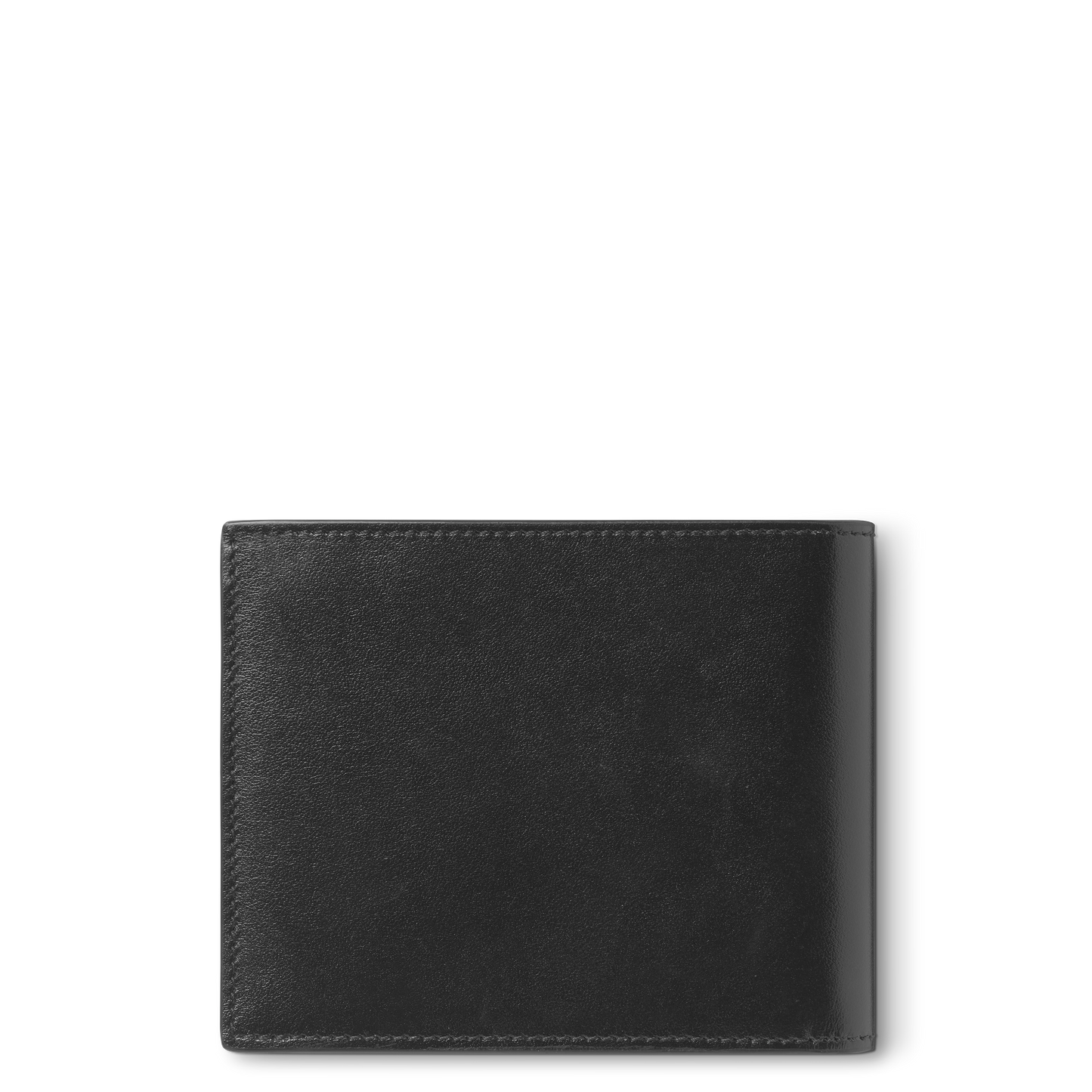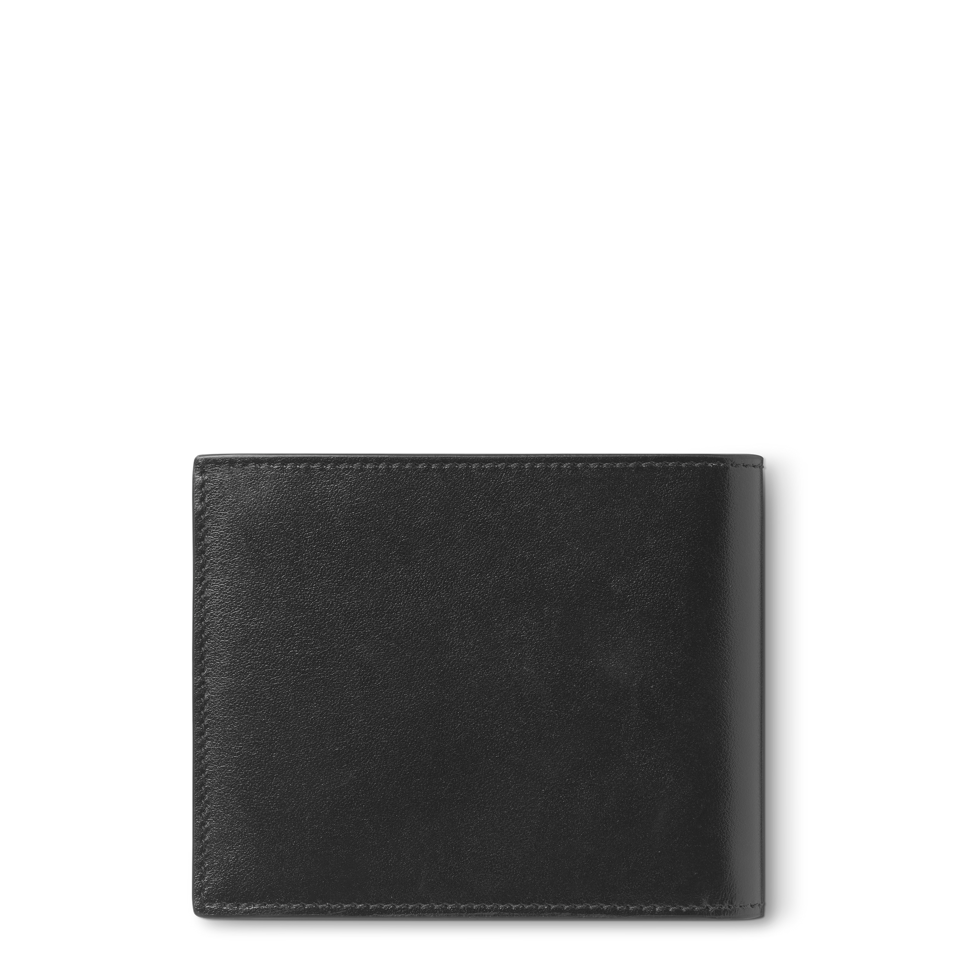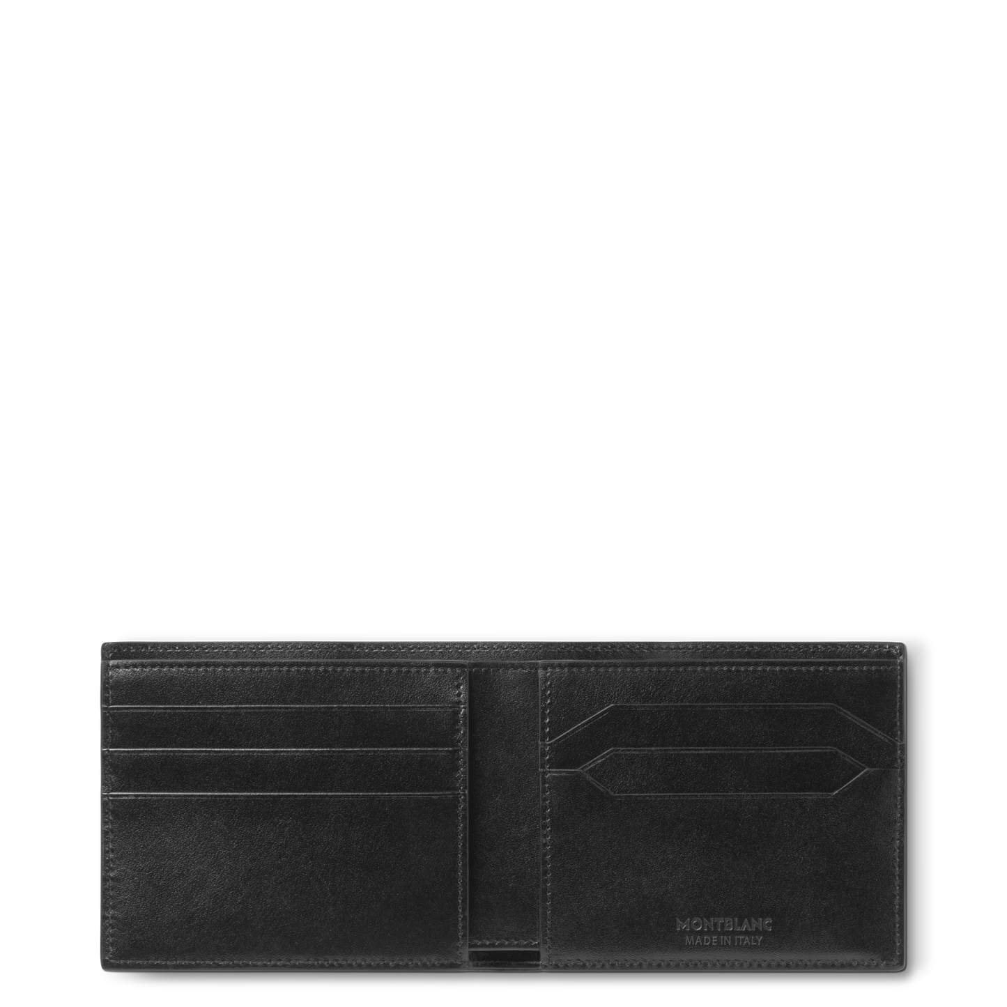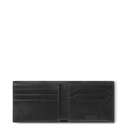The Montblanc Meisterstück wallet is made of black leather. It is designed with 6 credit card slots, two compartments for banknotes and two additional pockets for receipts. The wallet measures approximately 4.53 x 0.39 x 3.54 inches.