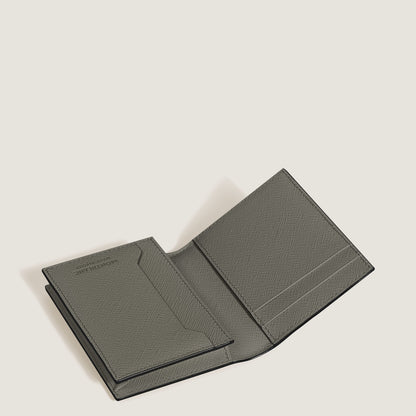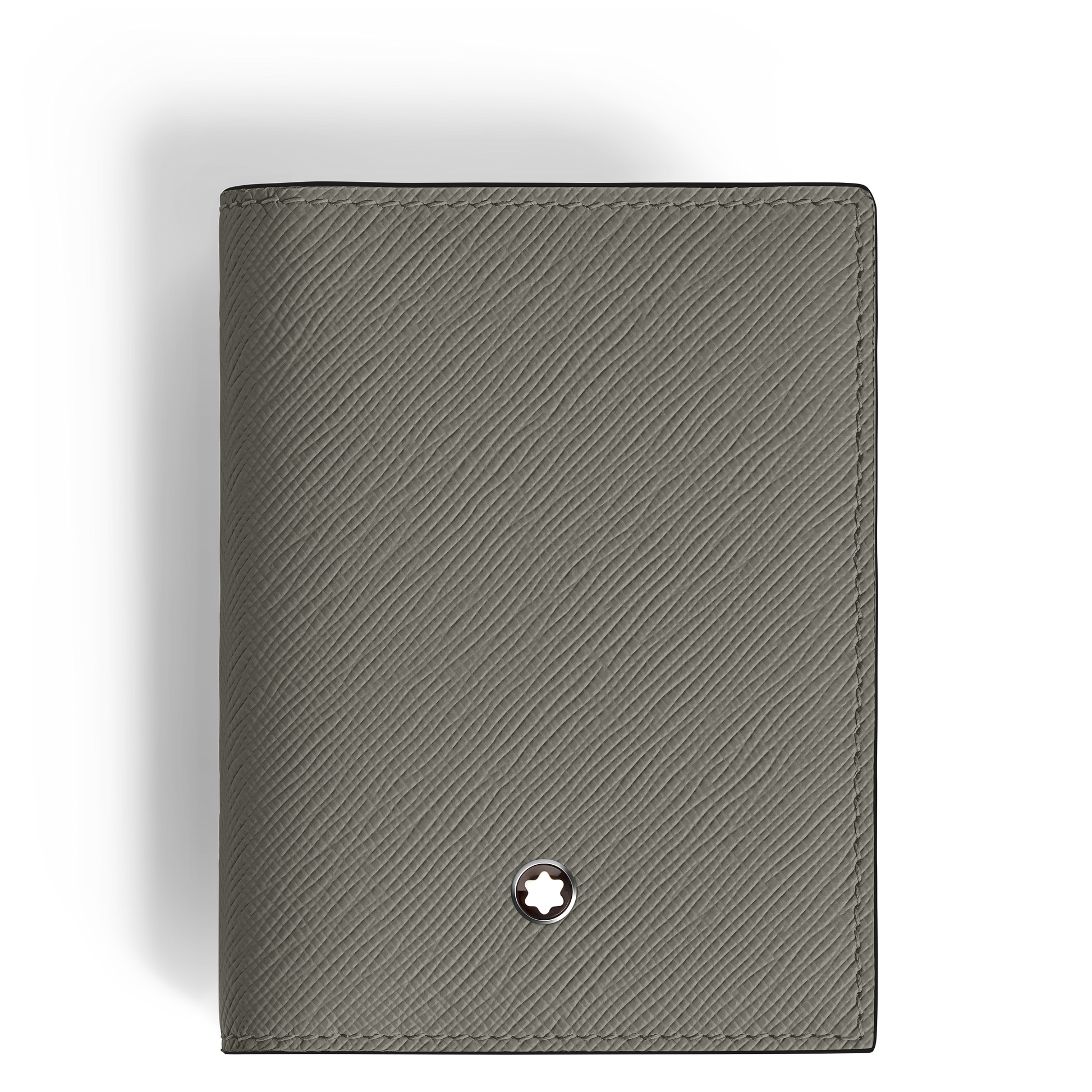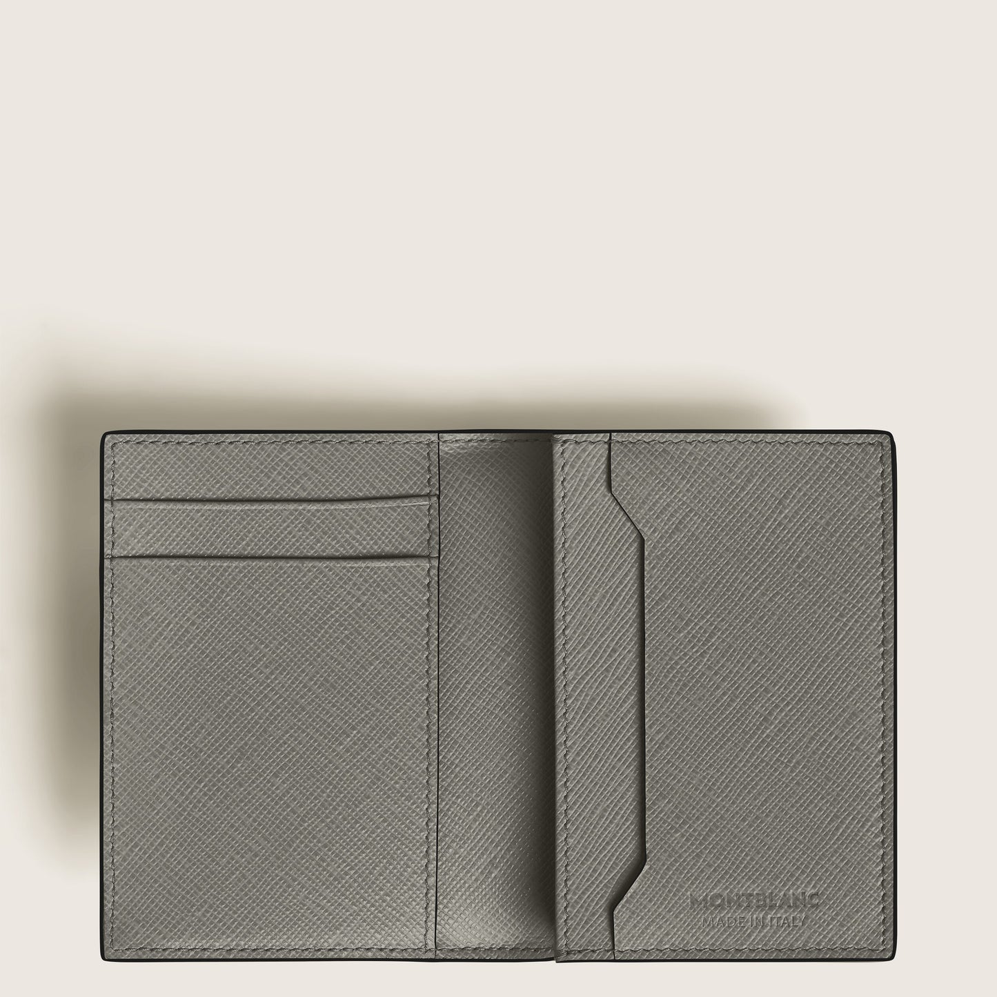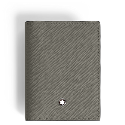 The Montblanc Sartorial card holder is crafted in medium gray leather. The interior includes space for up to three credit cards, a business card compartment, and additional pocket. The exterior features a fourth credit card slot. It measures approximately 2.95 x 0.39 x 4.33 inches.