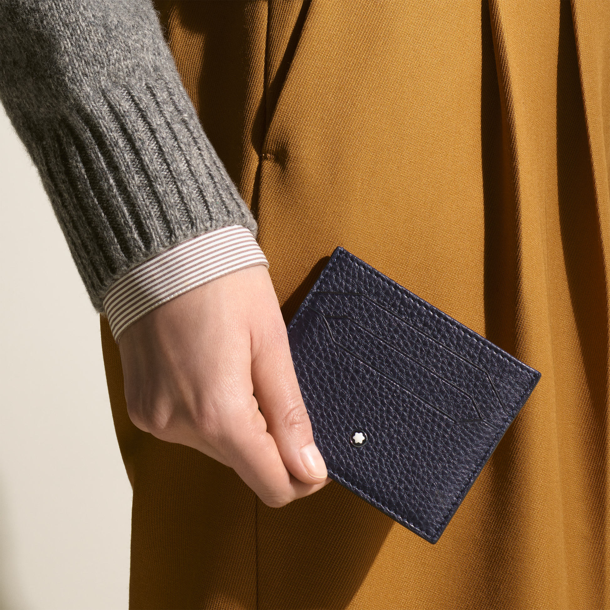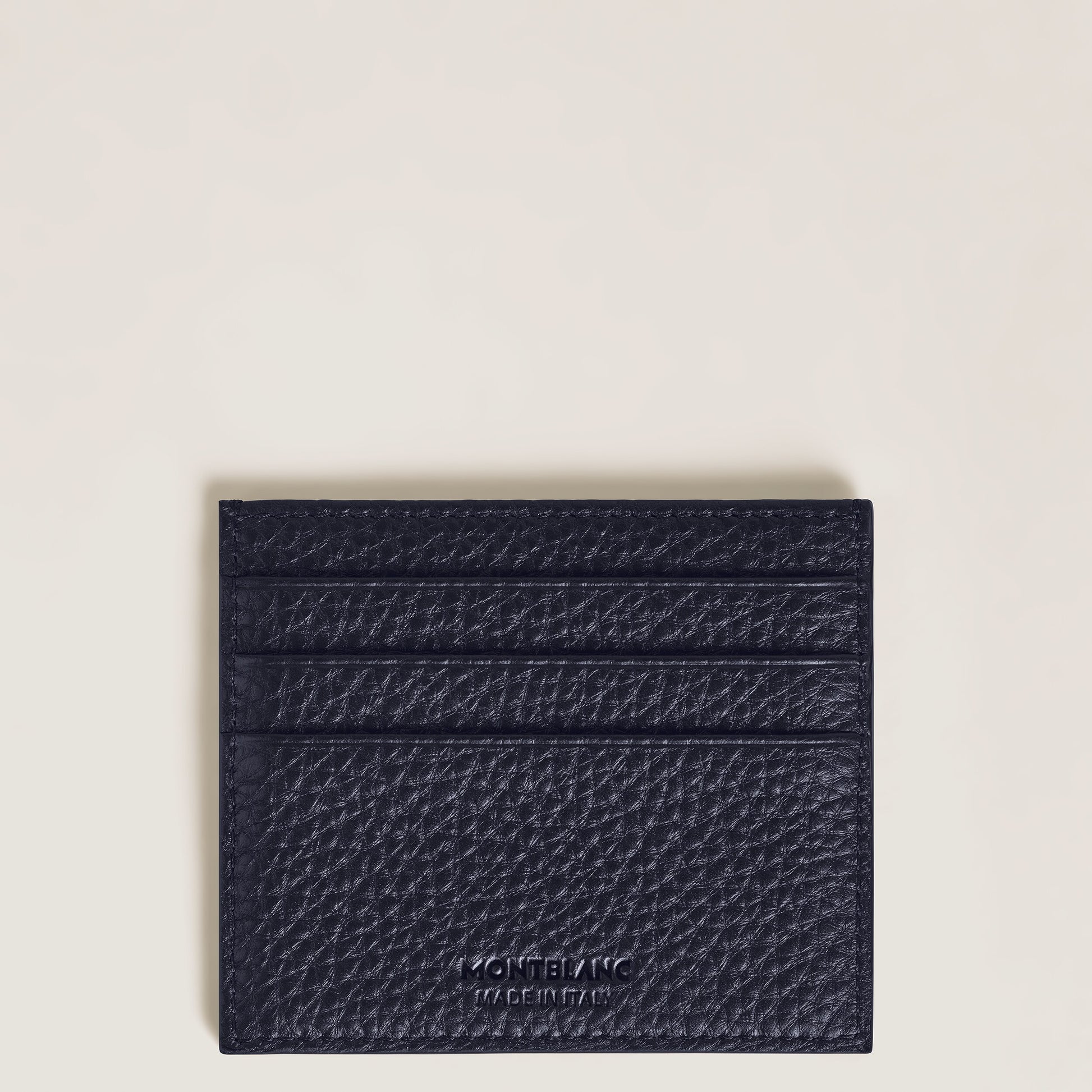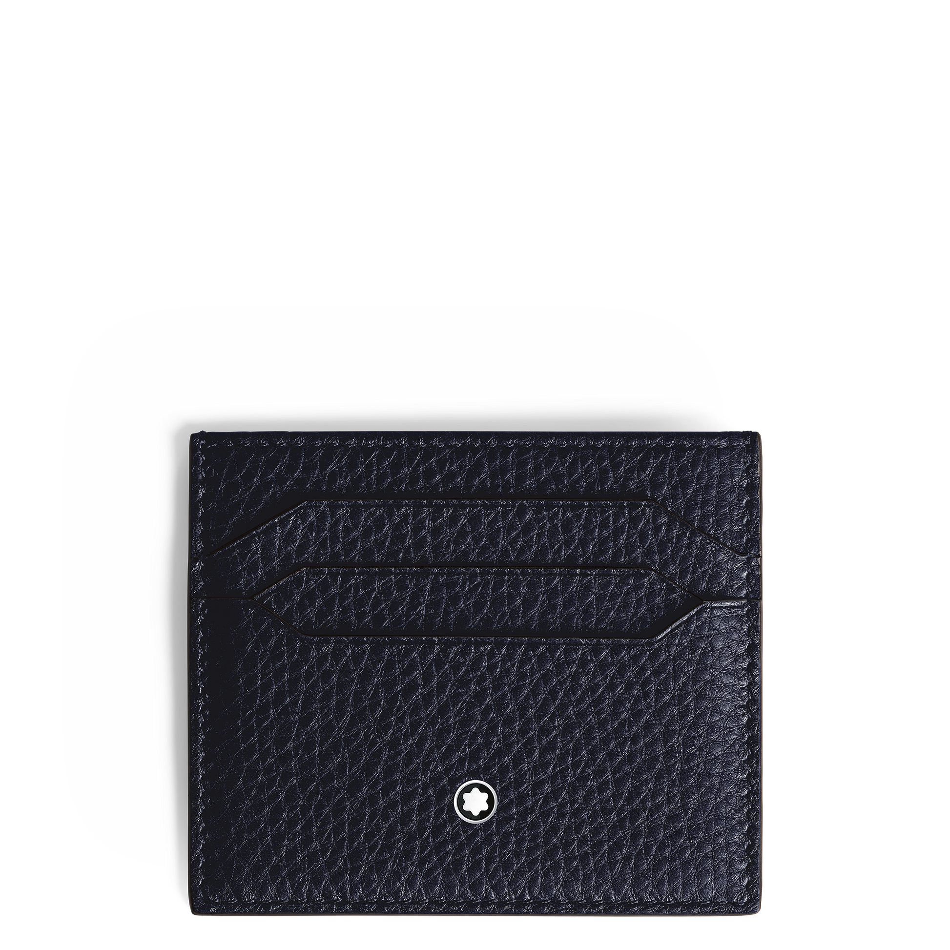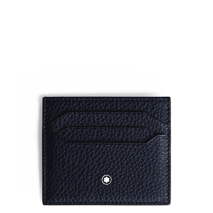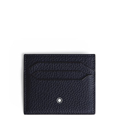 This Montblanc Soft Grain card holder is comprised of dark blue leather and features space for up to 6 credit cards. It measures approximately 3.94 x 0.20 x 3.35 inches.