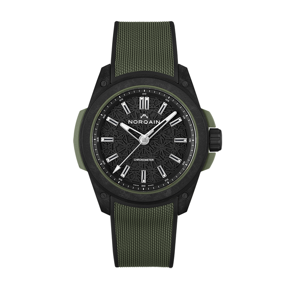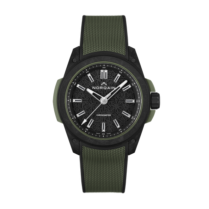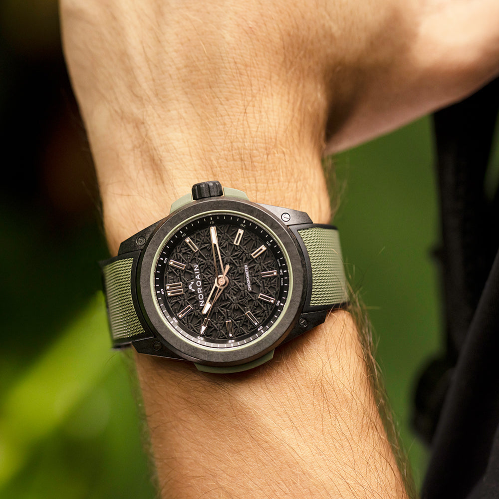 The NORQAIN Wild One Khaki watch is powered by an automatic movement inside of a titanium container. The 42mm case is comprised of a khaki green shock absorber and a black NORTEQ carbon fiber cage. The black laser cut dial is covered by sapphire crystal. The khaki green rubber strap is secured by a pin buckle. Water resistant to 200 meters.