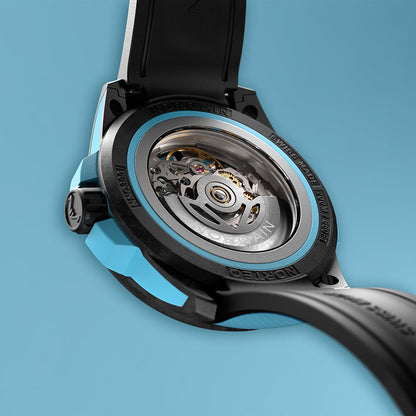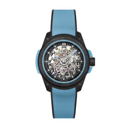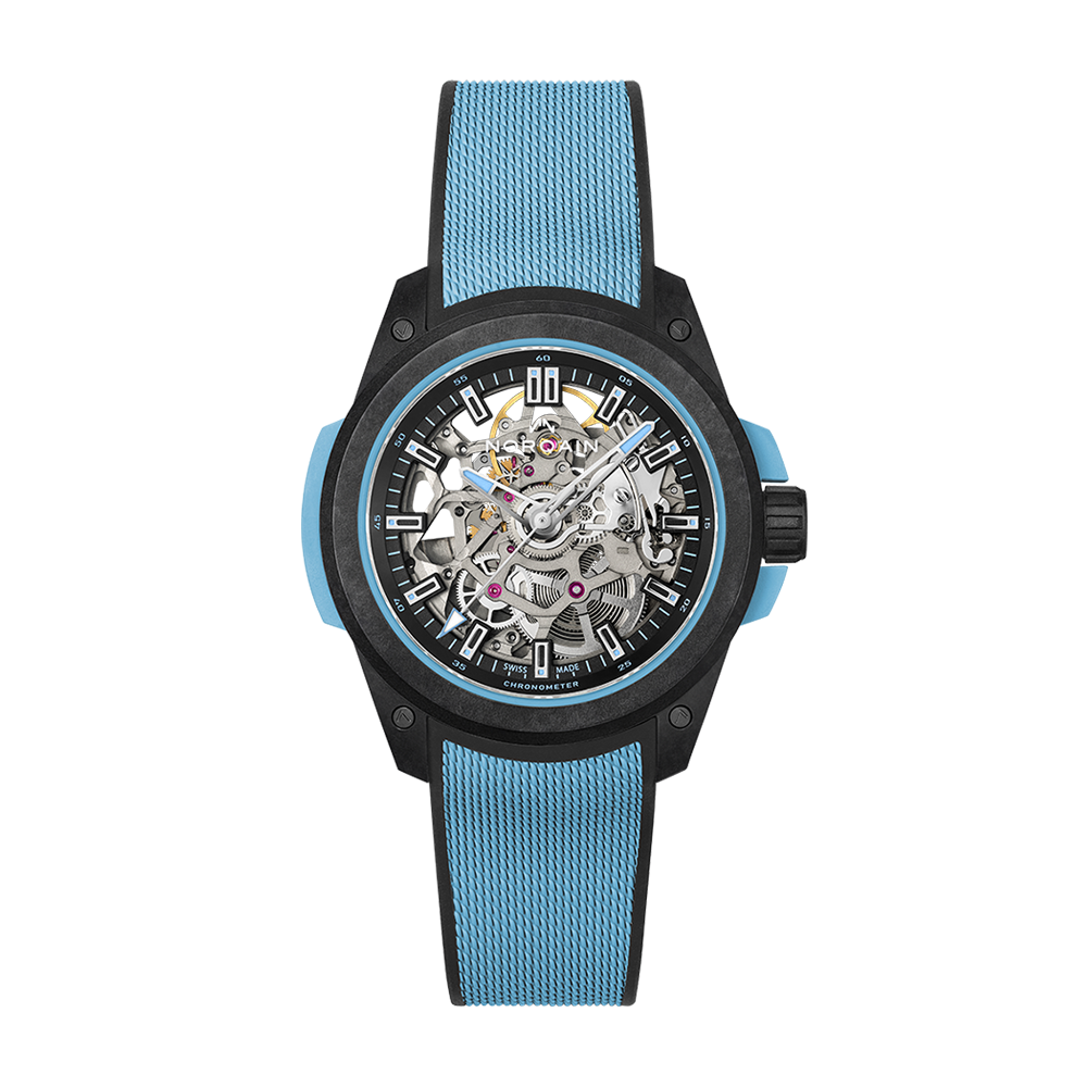 The NORQAIN Wild One Skeleton Sky Blue watch has an automatic movement contained within a titanium container. The 39mm case is comprised of a sku blue shock absorber and a black NORTEQ carbon fiber cage. The skeleton dial is covered with a sapphire crystal. The sky blue mesh strap with a milanese pattern includes a black NORTEQ pin buckle. Water resistant to 200 meters.