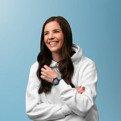 The NORQAIN Wild One Skeleton Sky Blue watch has an automatic movement contained within a titanium container. The 39mm case is comprised of a sku blue shock absorber and a black NORTEQ carbon fiber cage. The skeleton dial is covered with a sapphire crystal. The sky blue mesh strap with...