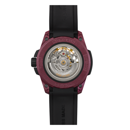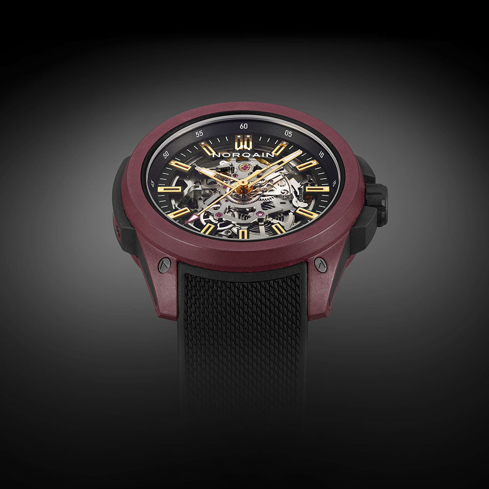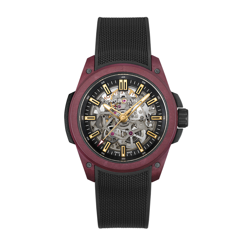 The NORQAIN Wild ONE skeleton limited edition watch is powered by an automatic movement within a titanium container. The 42mm case is comprised of a black rubber shock absorber and burgundy NORTEQ carbon fiber cage. The skeleton dial is protected by anti-reflective sapphire glass. The black rubber strap includes a burgundy NORTEQ pin buckle. Water resistant to 200 meters. Limited edition of 300 pieces.