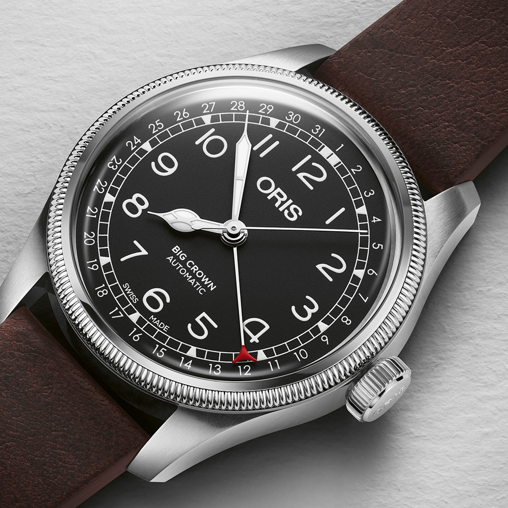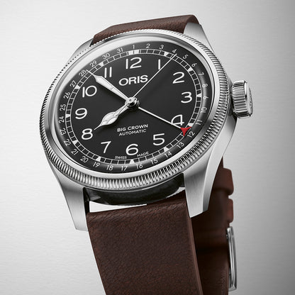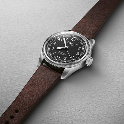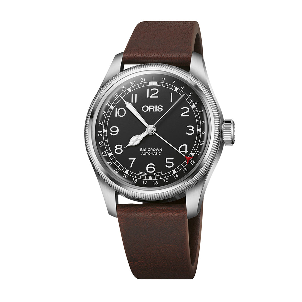 The Oris Big Crown Waldenburgerbahn limited edition watch has an automatic movement inside of a 40mm stainless steel case. The black dial is protected by sapphire crystal. The dark brown leather strap leads to a stainless steel tang buckle. Water resistant to 50 meters.