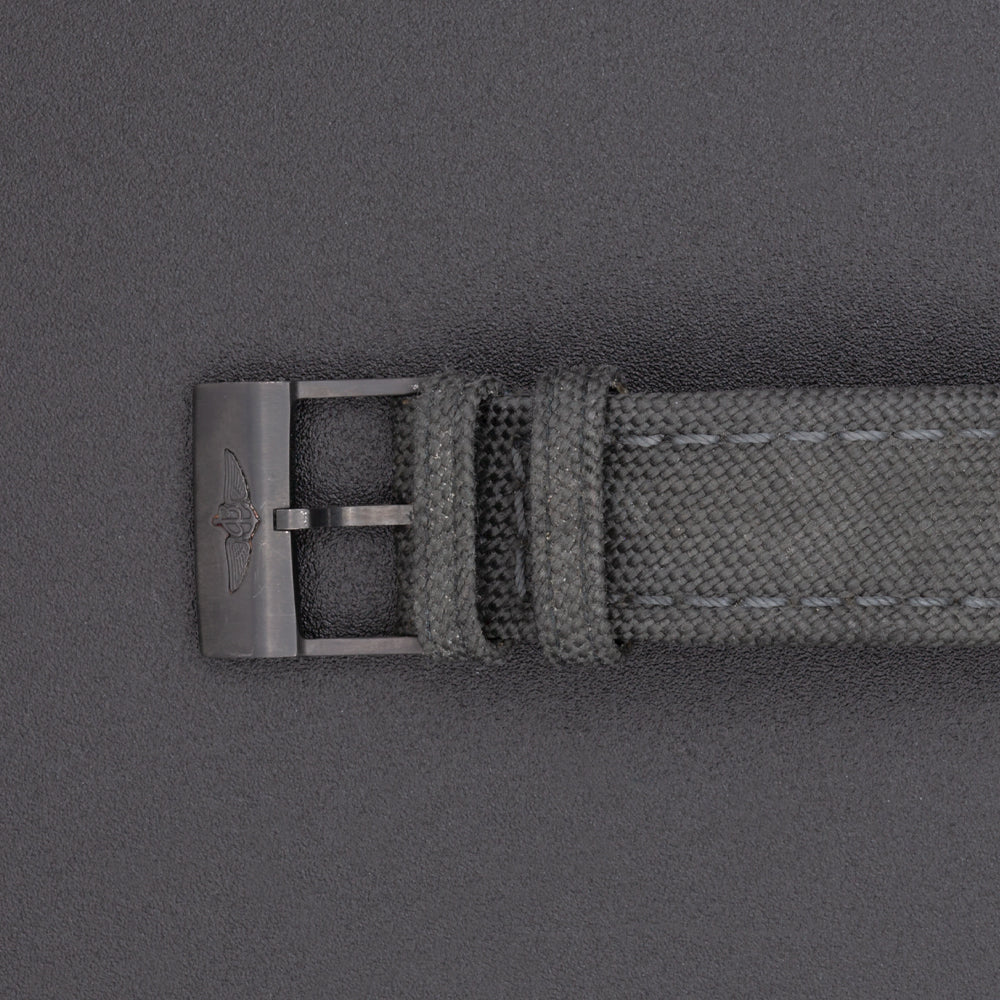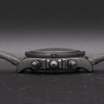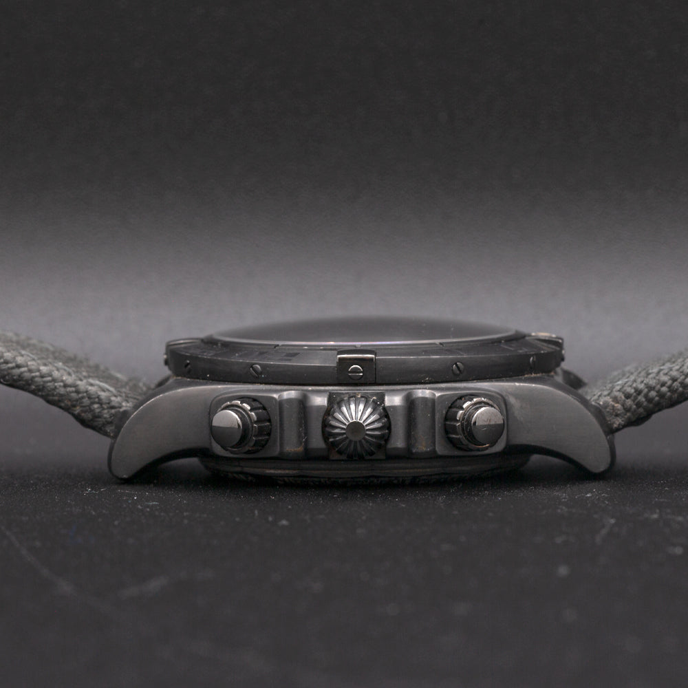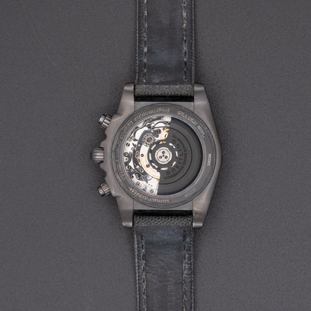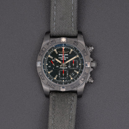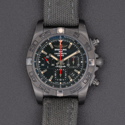 This pre-owned Breitling Chronomat 01 is powered by an automatic movement contained within a 44mm black steel case. The black dial reveals a tachymeter scale, chronograph function, and date. It is protected by sapphire crystal. The black military fabric strap has a tang buckle. This Breitling reference MB0111C3/BE35 is in good condition.