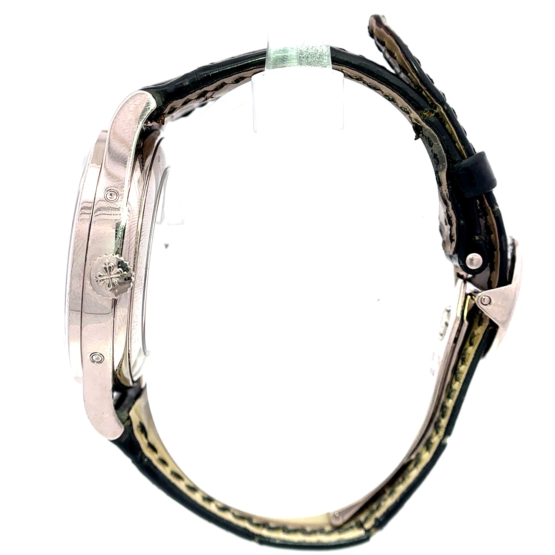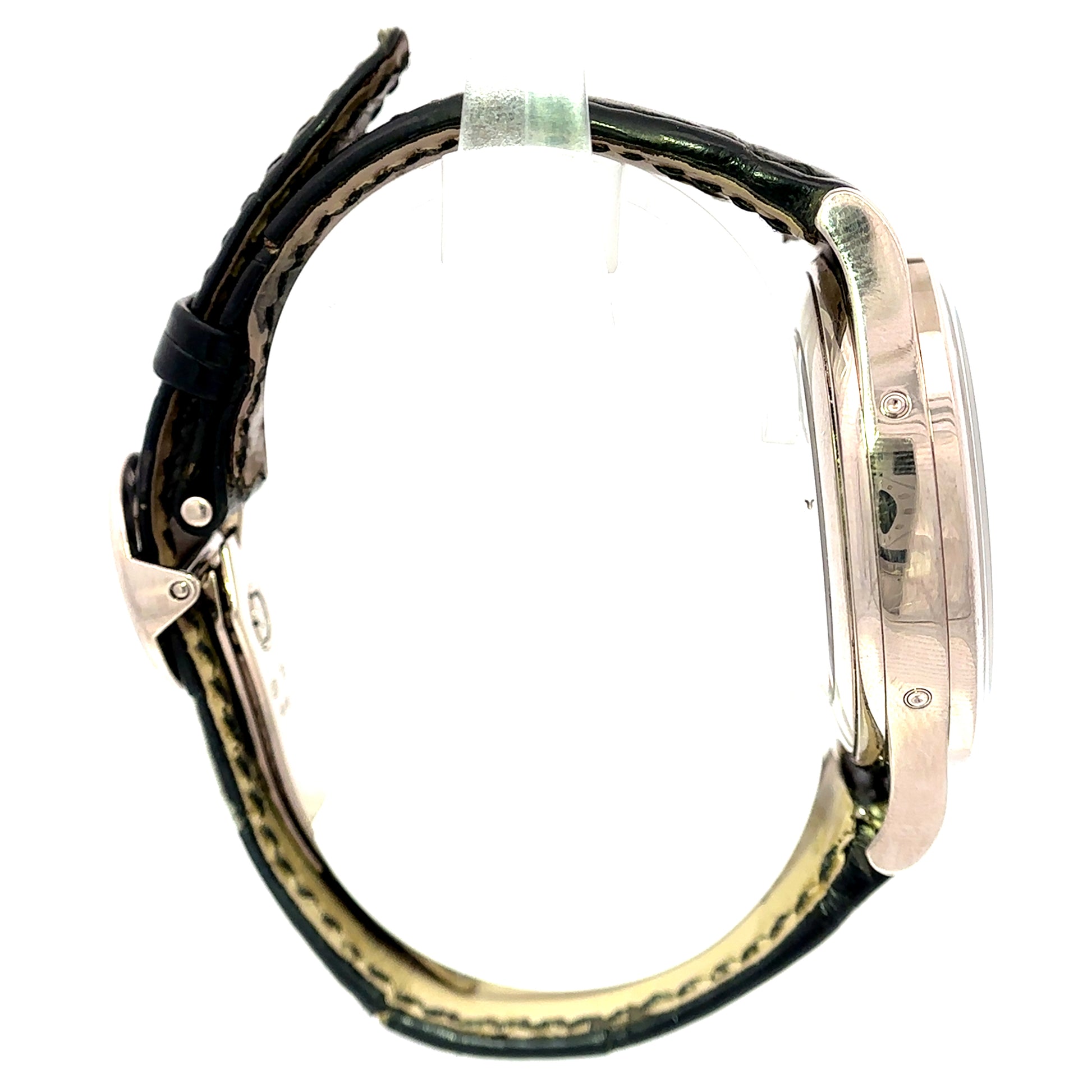 This pre-owned Patek Philippe 5396G-001 Annual Calendar Moonphase watch is powered by an automatic movement housed in a 38mm white gold case. Its silver dial displays the month, day, date, and moonphase complication. The dark brown leather strap is secured by a white gold deployant clasp....