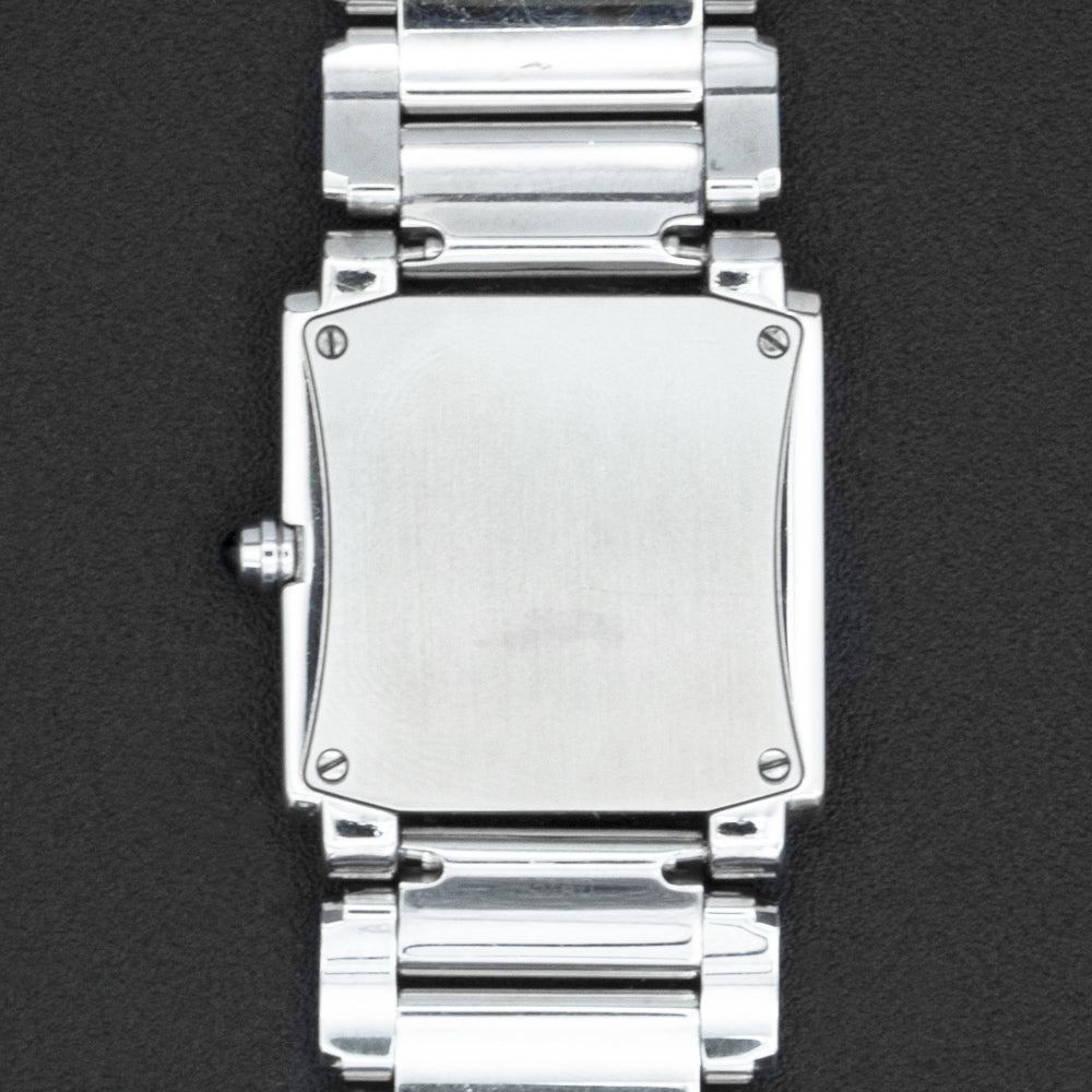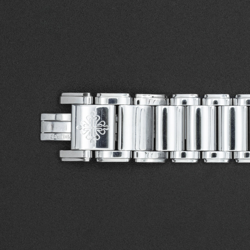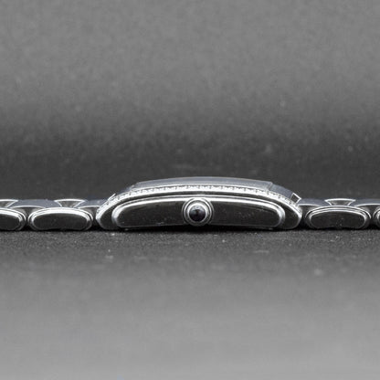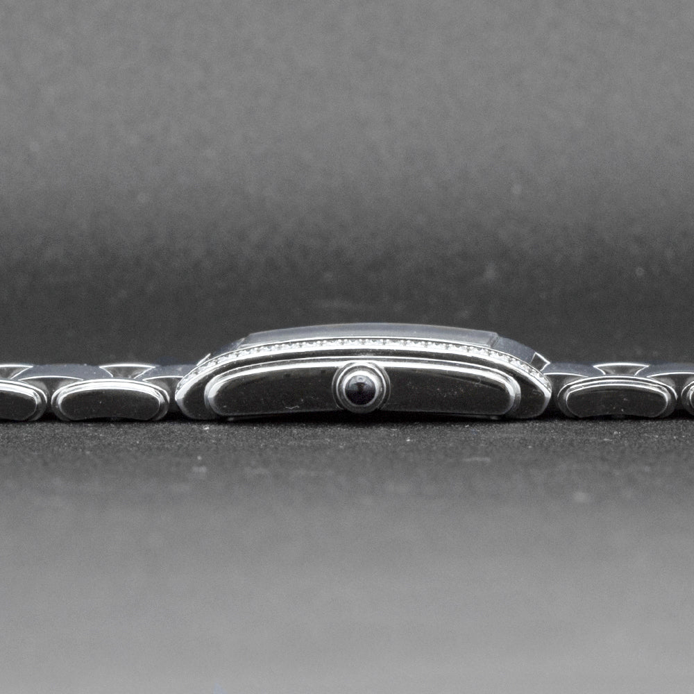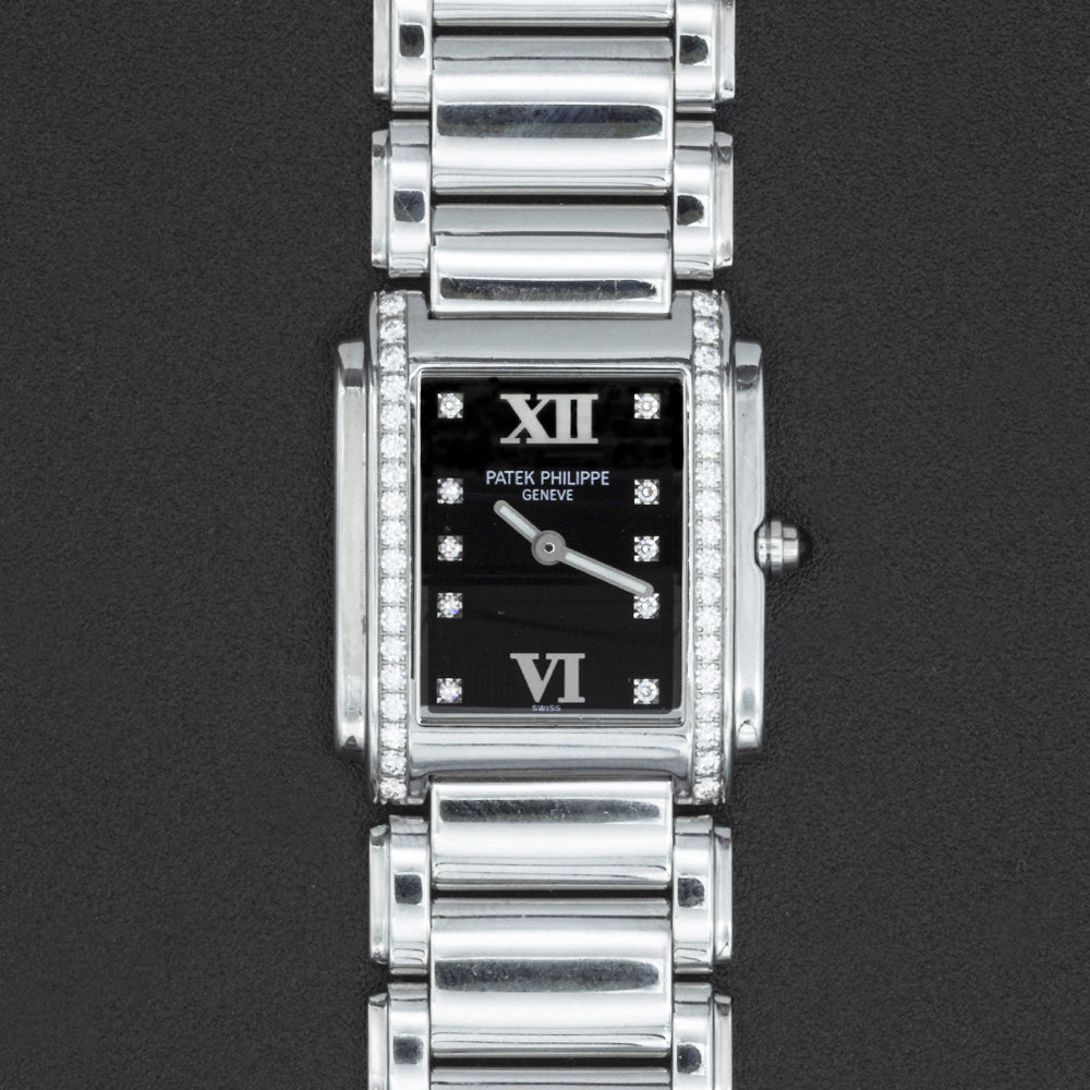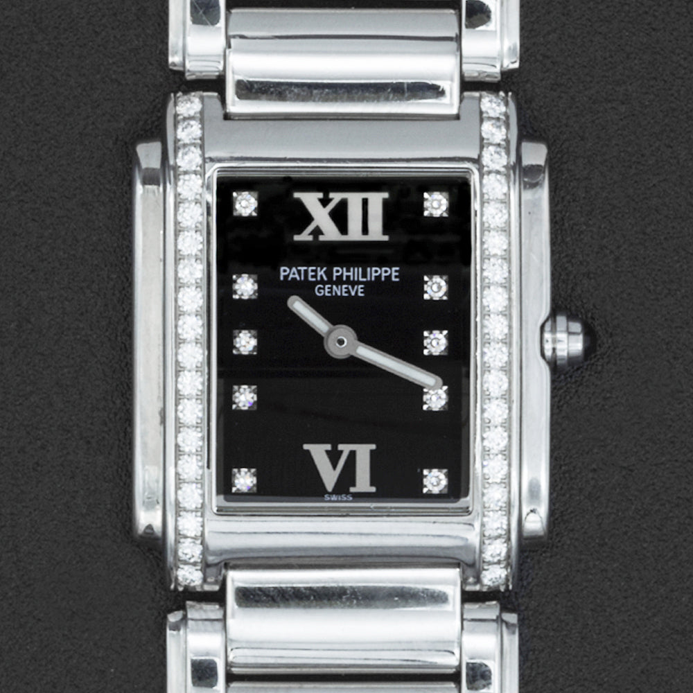 This pre-owned Patek Philippe Twenty-4 is powered by a quartz movement in a 30mm x 25mm stainless steel case with diamond bezel. The black dial reveals diamond markers and is protected by sapphire crystal. The steel bracelet has a folding clasp. This Patek Philippe reference 1910/10A-001 is in very good condition. Includes box, but no papers.