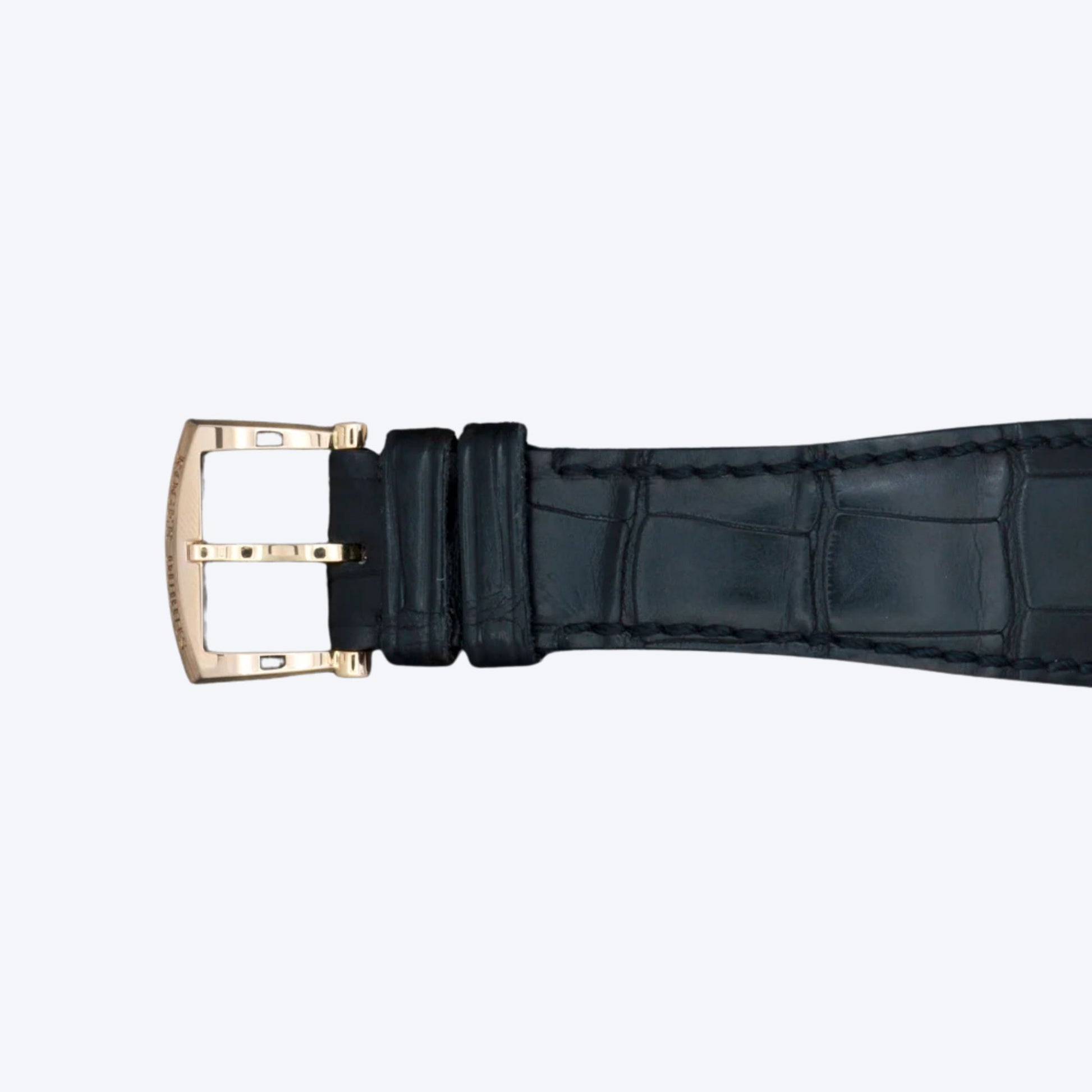 This pre-owned Roger Dubuis Sympathie is powered by a manual movement in a 39mm rose gold case. The white dial showcases a chronograph function, moon phase display, and retrograde day and date functions. It is protected by sapphire crystal. The black leather strap has a rose gold tang buckle. This...
