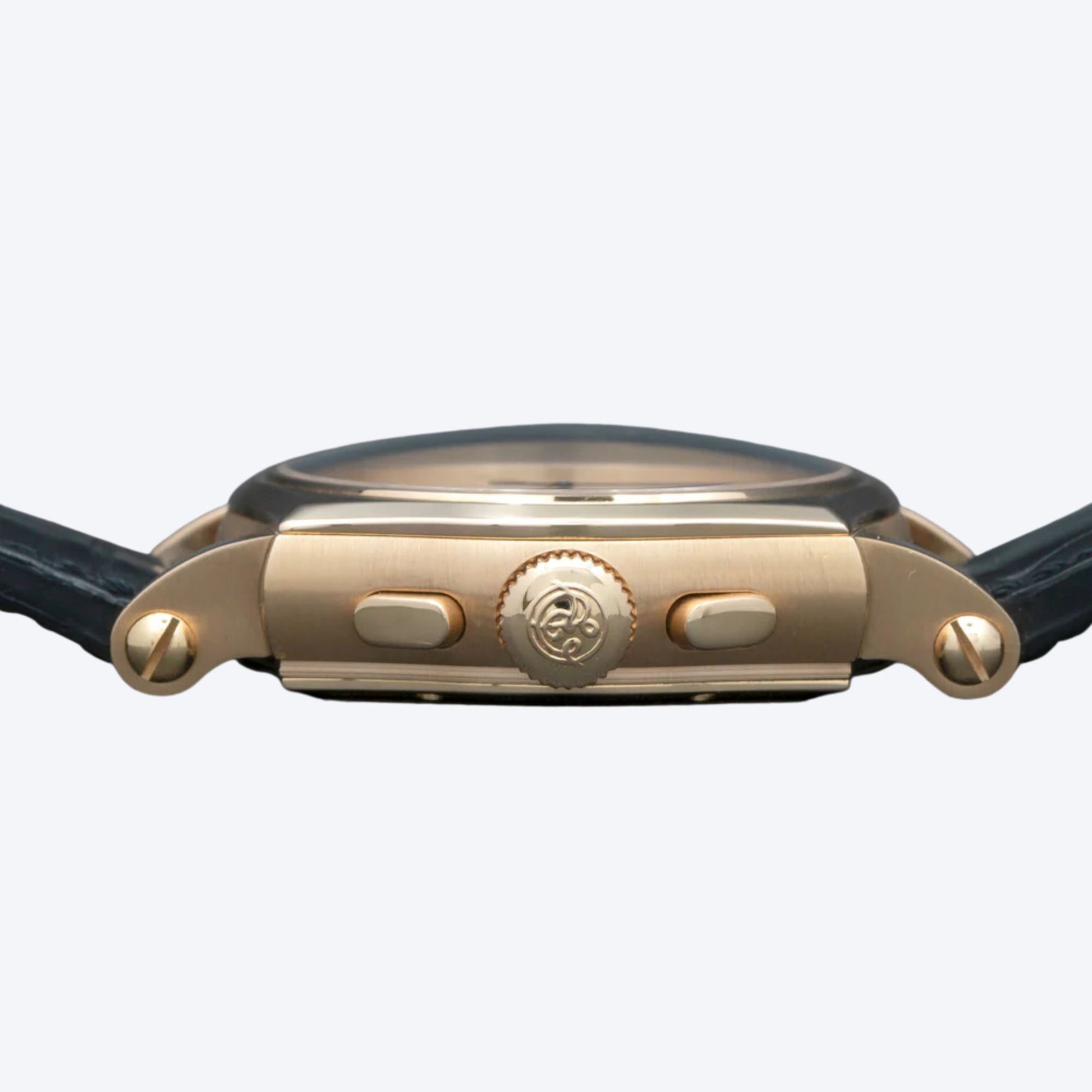 This pre-owned Roger Dubuis Sympathie is powered by a manual movement in a 39mm rose gold case. The white dial showcases a chronograph function, moon phase display, and retrograde day and date functions. It is protected by sapphire crystal. The black leather strap has a rose gold tang buckle. This Roger Dubuis reference S40 5635 5 is in excellent condition with box and papers. Limited edition of 28 pieces.