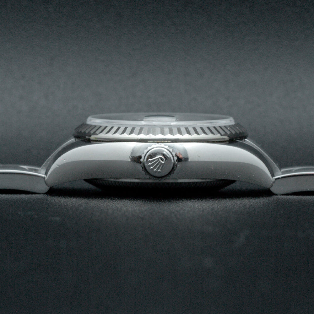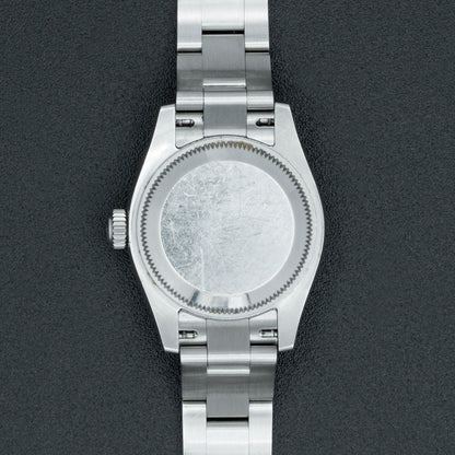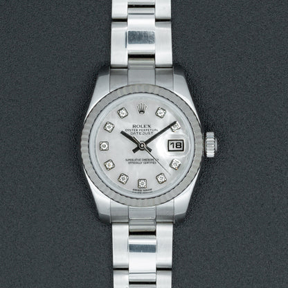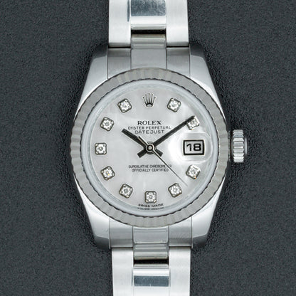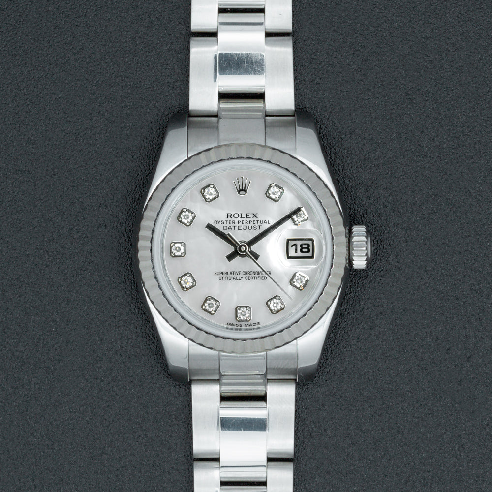 This pre-owned Rolex Datejust contains an automatic movement contained within a 26mm stainless steel case with a fluted bezel. The mother-of-pearl dial has diamond markers and a date display. The stainless steel Oyster bracelet includes a folding clasp. This Rolex reference M179174 is in good condition. Circa 2017. Includes box and papers.