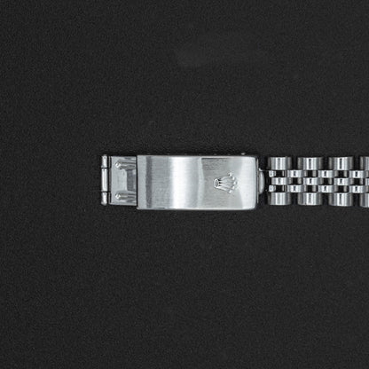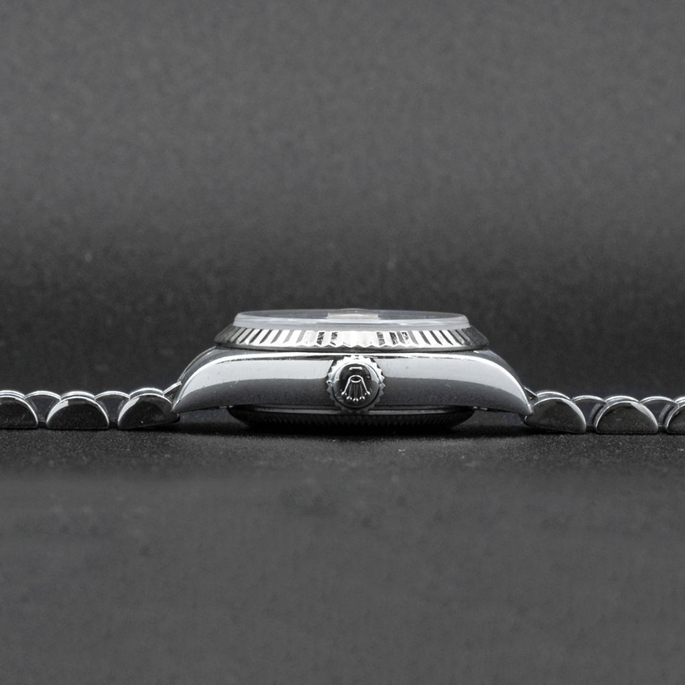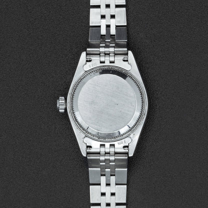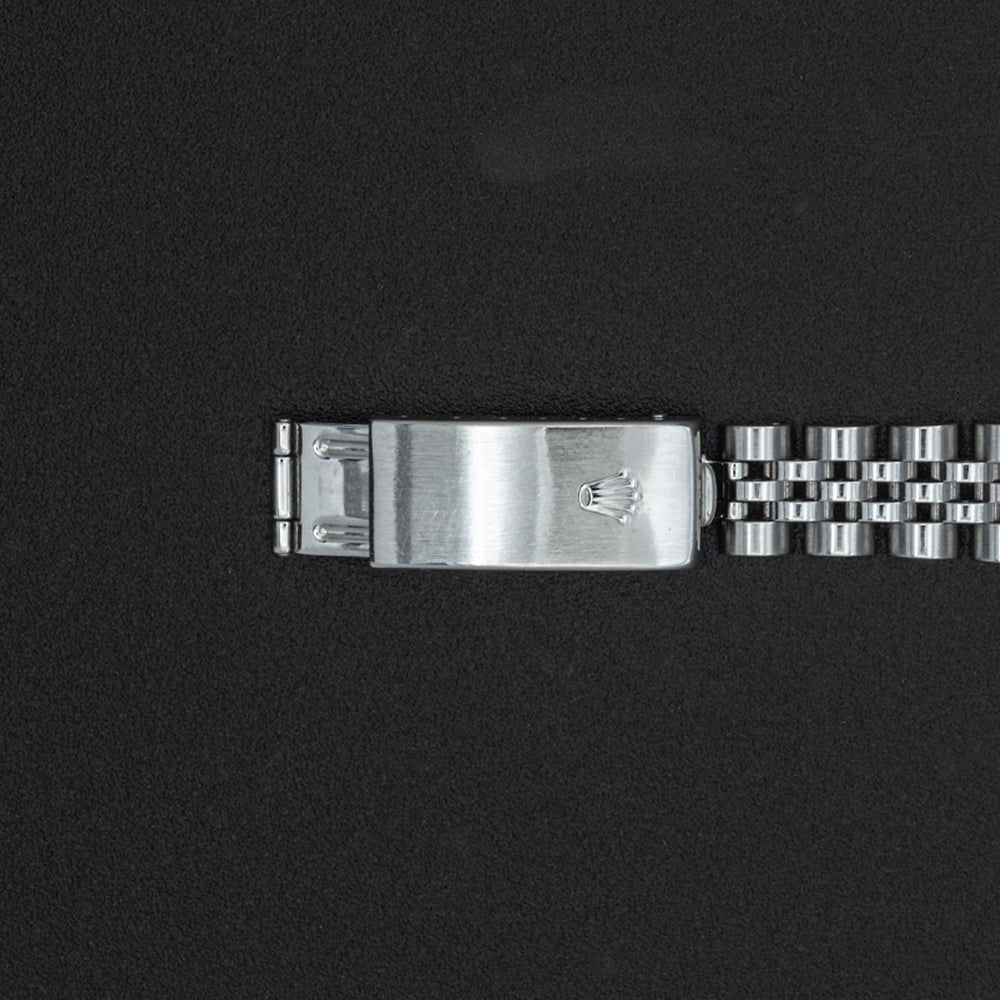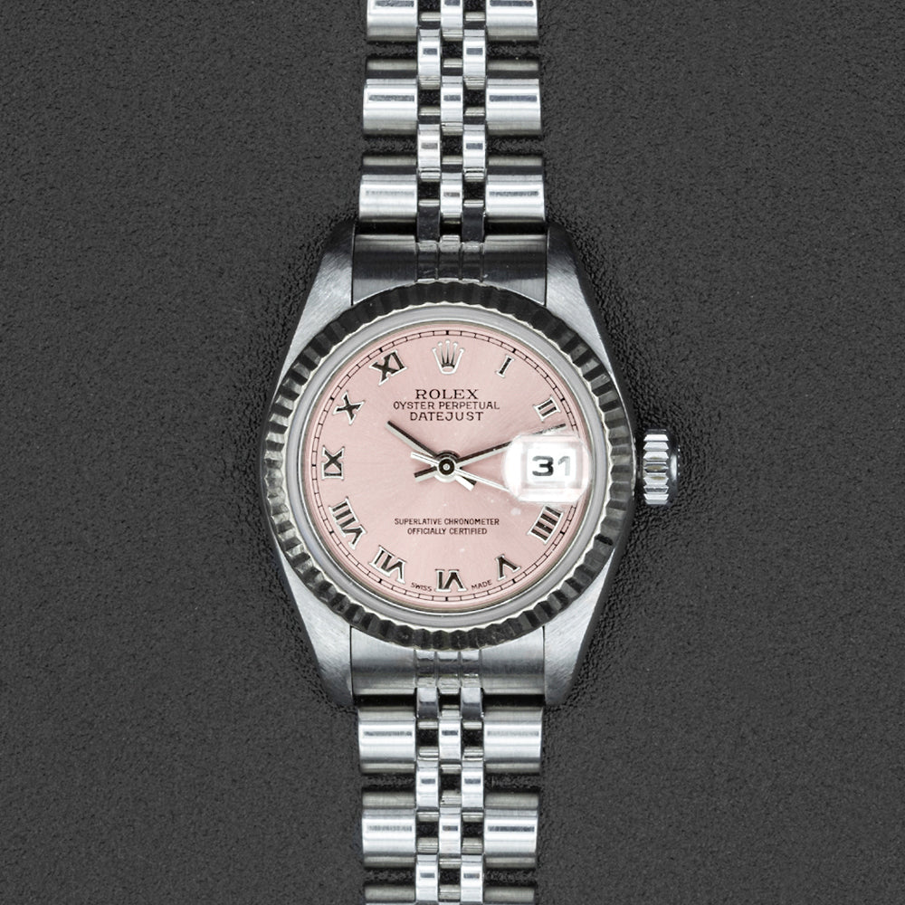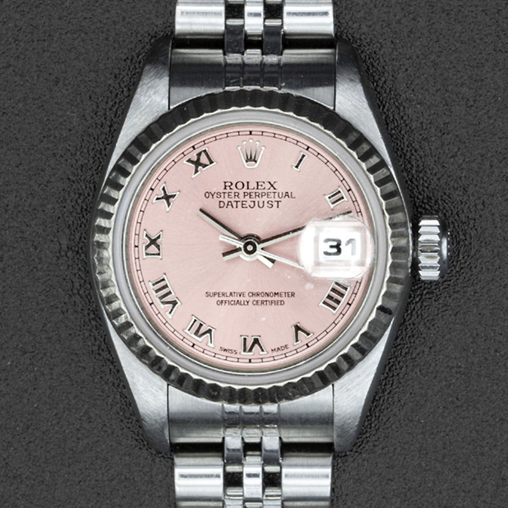 This pre-owned Rolex Datejust has a 26mm stainless steel case with a fluted bezel. The pink dial has Roman numerals and a date display. It is covered by sapphire crystal. The stainless steel jubilee bracelet has a folding clasp. This Rolex reference 79174 is in fair condition. Features box and papers. Circa 2003.
