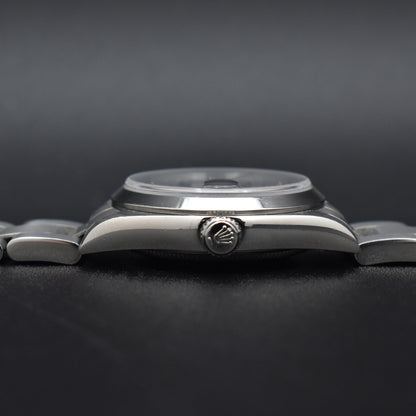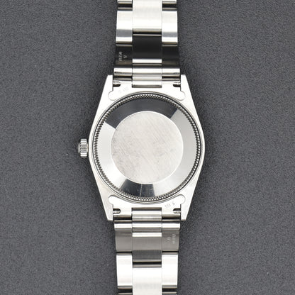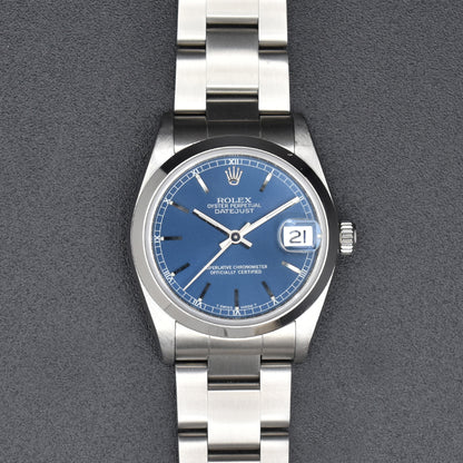 This used Rolex Datejust showcases a "Blue Denim" dial with a date window. It is powered by an automatic movement within a 31mm stainless steel case with a smooth bezel. The steel Oyster bracelet includes a folding clasp. This Rolex reference 68240 is in excellent condition and comes complete with box and papers. Circa 1998.