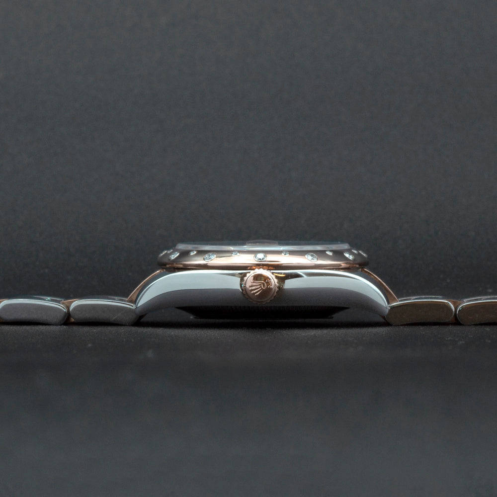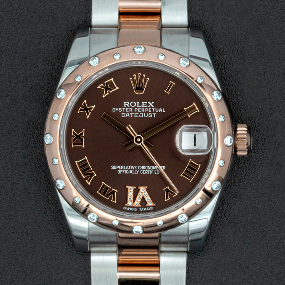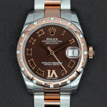 This pre-owned Rolex Datejust has an automatic movement in a 31mm stainless steel and rose gold case with a diamond-set bezel. The chocolate dial showcases a diamond Roman numeral 6 and a date display. It is covered by sapphire crystal. The stainless steel and rose gold Oyster bracelet features a folding clasp. This Rolex reference M178341 is in excellent condition. Includes box and papers. Circa 2012.