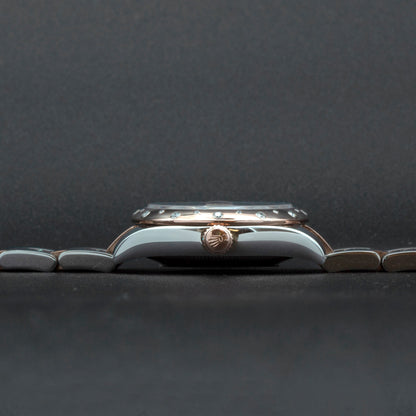 This pre-owned Rolex Datejust has an automatic movement in a 31mm stainless steel and rose gold case with a diamond-set bezel. The chocolate dial showcases a diamond Roman numeral 6 and a date display. It is covered by sapphire crystal. The stainless steel and rose gold Oyster bracelet features a...