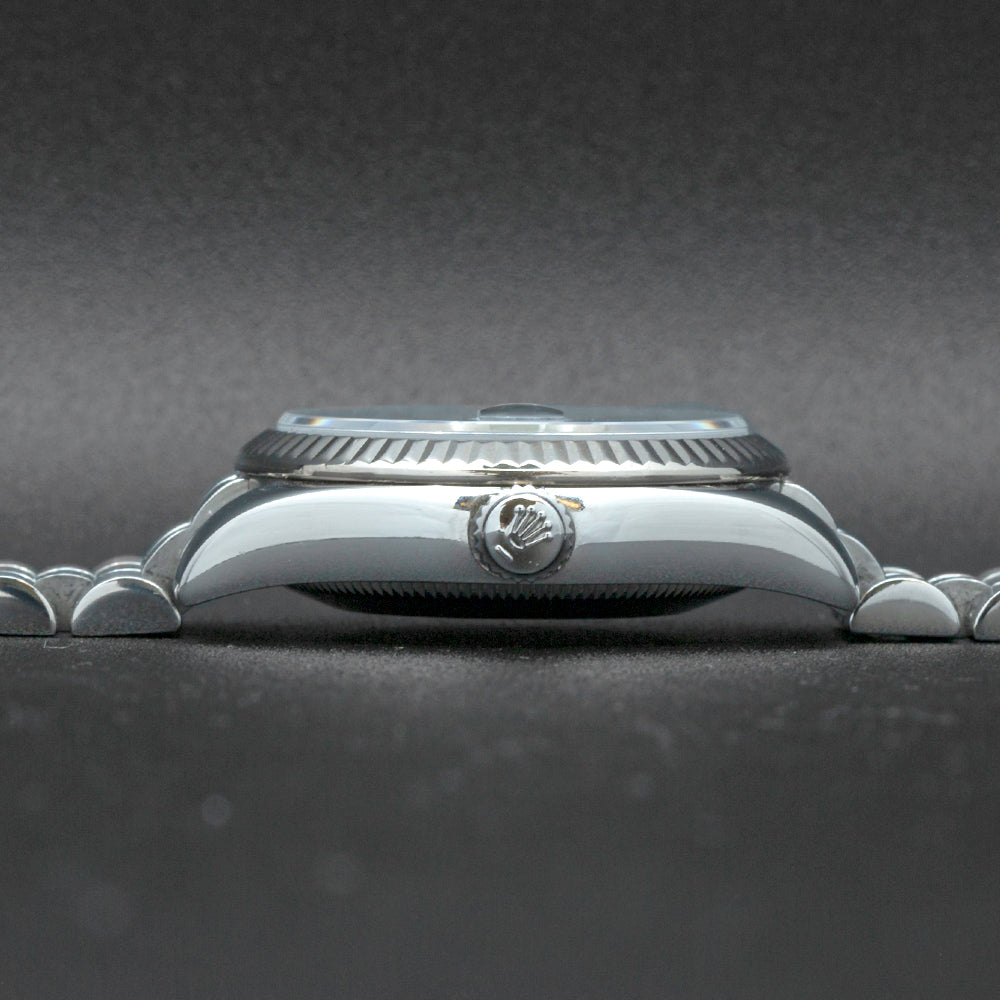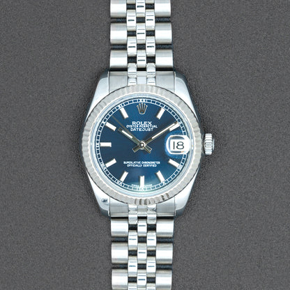 This pre-owned Rolex Datejust contains an automatic movement in a 31mm stainless steel case with a fluted bezel. The blue dial showcases a date display and is protected by sapphire crystal. The stainless steel Jubilee bracelet leads to a folding clasp. This Rolex reference M178274 is in very good condition. Includes box and papers. Circa 2011.
