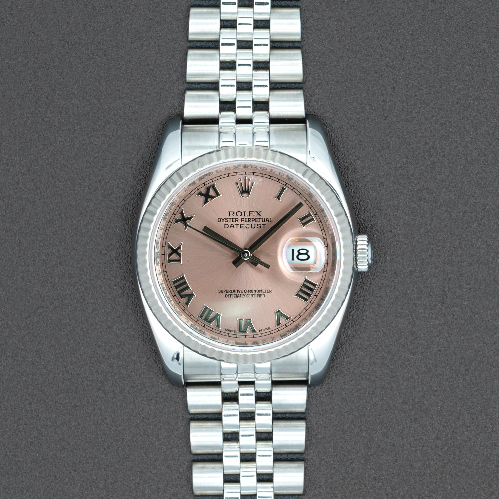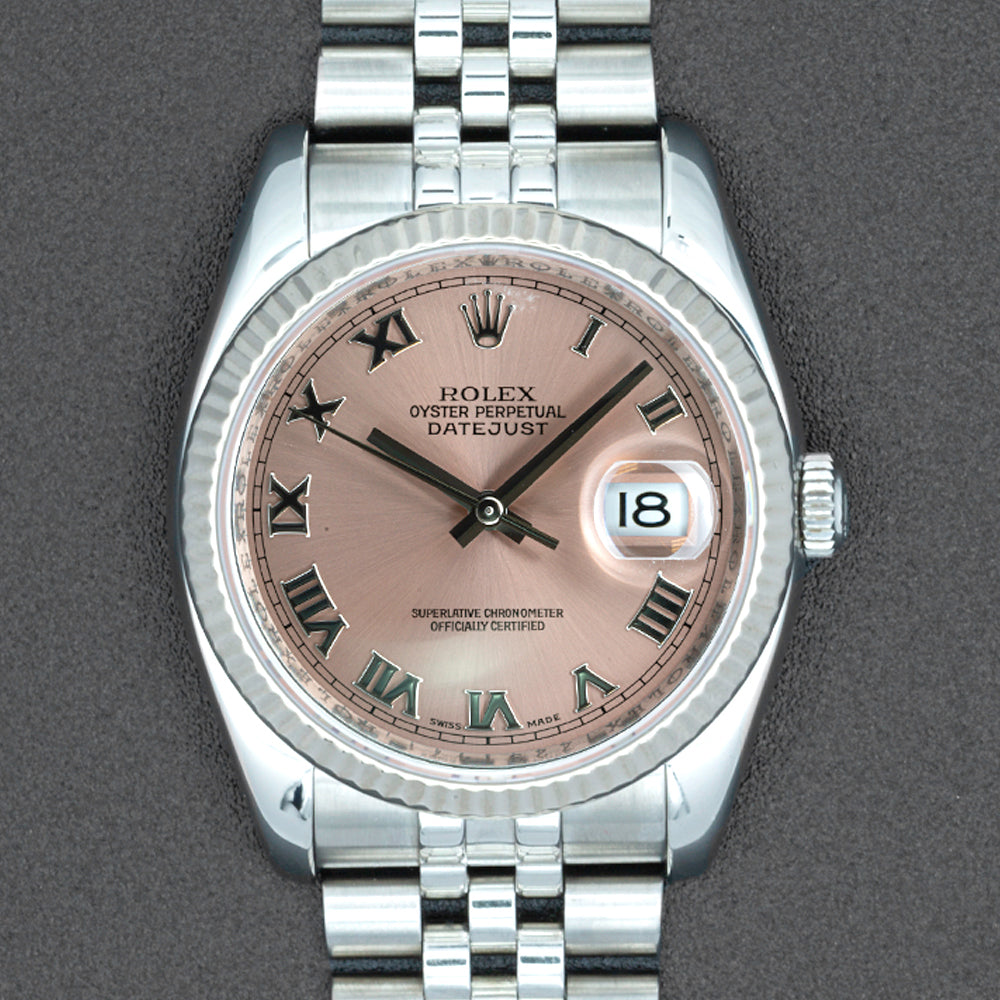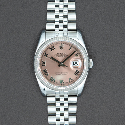 This pre-owned Rolex Datejust contains an automatic movement in a 36mm stainless steel case with a fluted bezel. The pink dial has Roman numerals and a date display. It is protected by sapphire crystal. The steel jubilee bracelet has a folding clasp. This Rolex reference M116234 is in very good condition. Circa 2008. Includes box, but not paperwork.