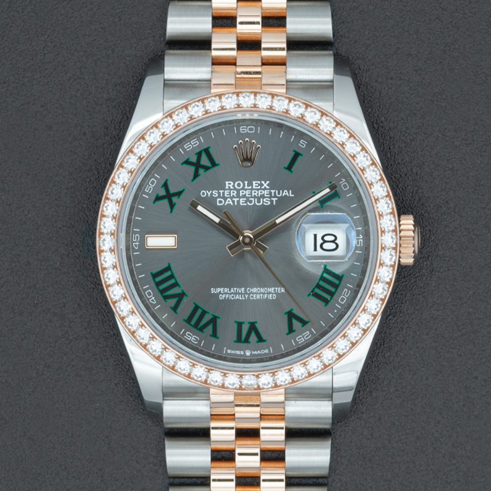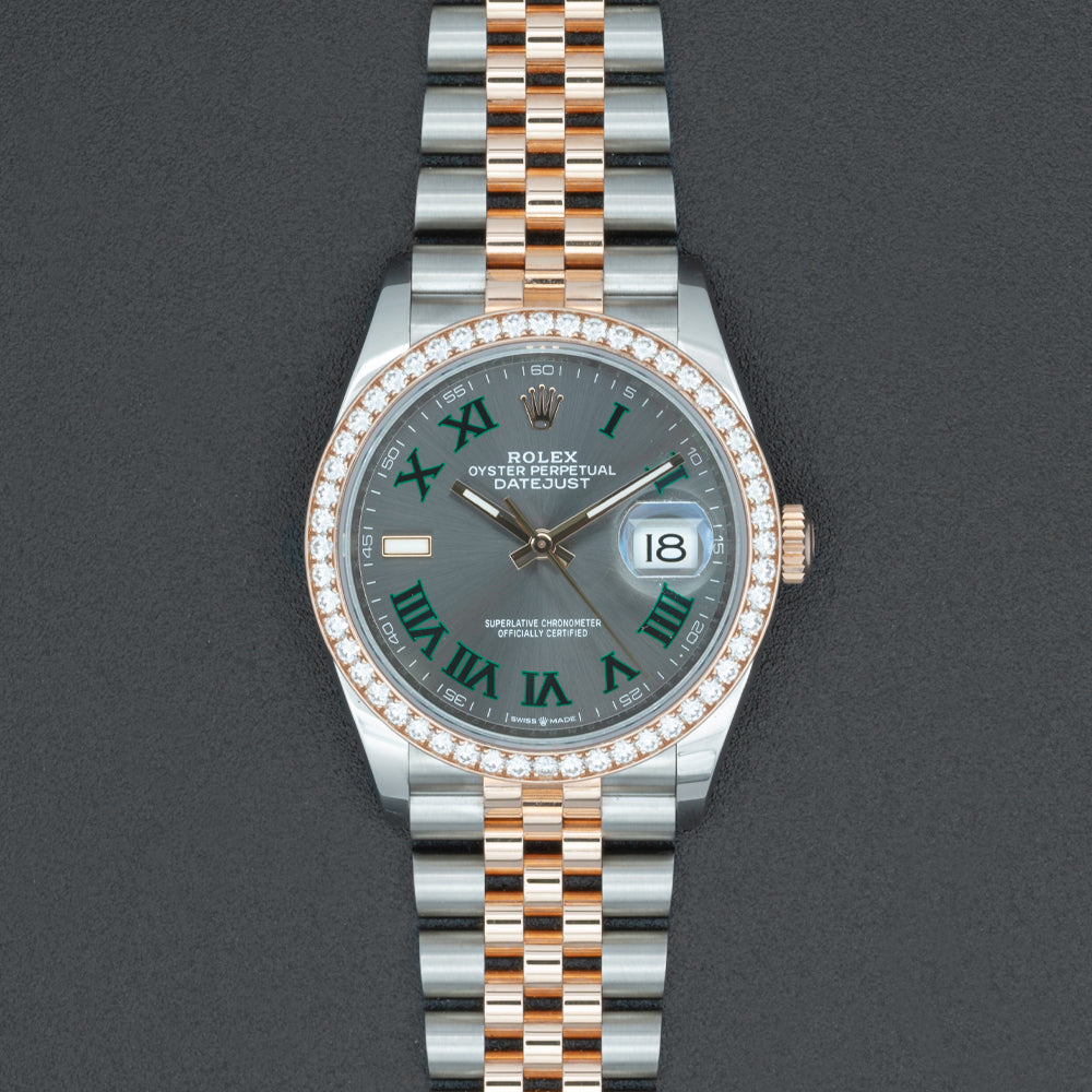 This pre-owned Rolex Datejust includes an automatic movement in a 36mm stainless steel and rose gold case with a diamond bezel. The rhodium dial has green-outlined Roman numerals and a date display. It is covered by sapphire crystal. The steel and rose gold jubilee bracelet has a folding clasp. This Rolex reference M126281RBR is in like-new condition and is complete with box and papers.
