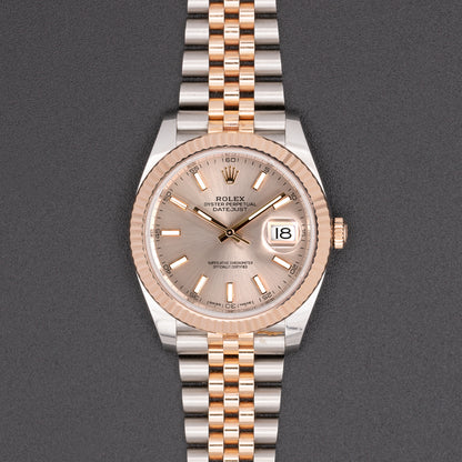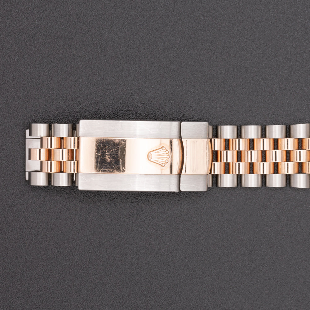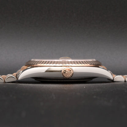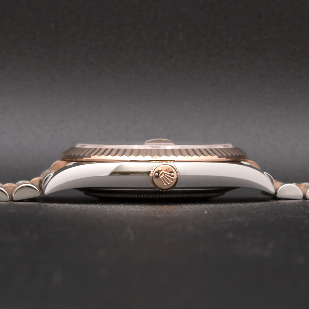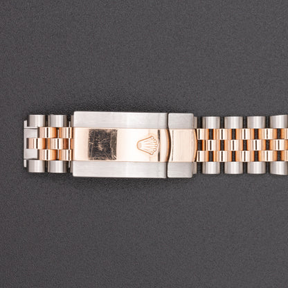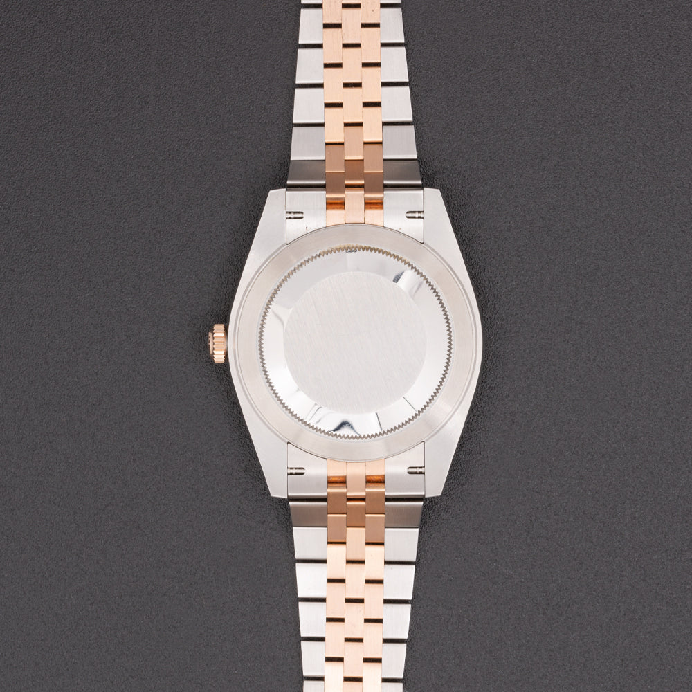 This pre-owned Rolex Datejust features an automatic movement in a 41mm stainless steel case with a fluted rose gold bezel. The sundust dial reveals a date window and is protected by sapphire crystal. The stainless steel and rose gold jubilee bracelet has a folding clasp. This Rolex reference M126331 is in very good condition. Circa 2018.