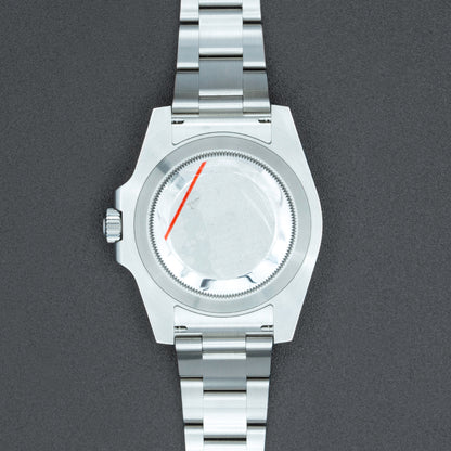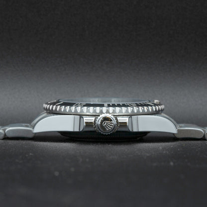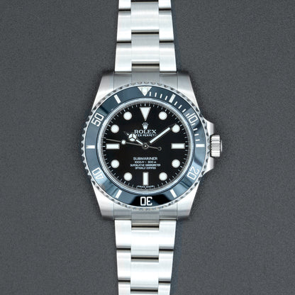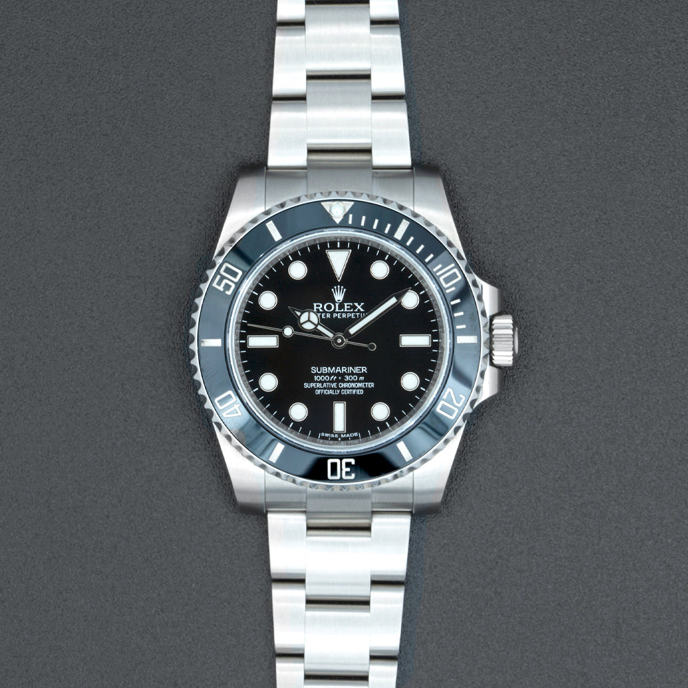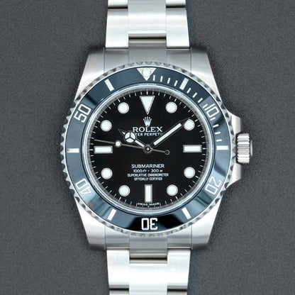 This pre-owned Rolex Submariner features an automatic movement in a 40mm stainless steel case with rotating black bezel. The dial is black and is protected by sapphire crystal. The steel bracelet has a folding clasp. This Rolex reference M114060-0002 is in excellent condition. Includes box and papers. Circa 2014.