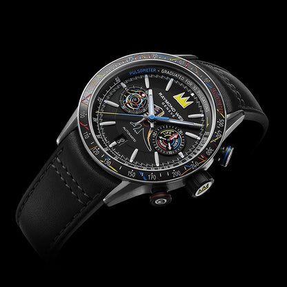 The Raymond Weil Freelancer Basquiat special edition watch has an automatic movement housed within a 43.50mm titanium case. The black ceramic bezel features tachymeter scale. The black "Pez Dispenser" dial features a chronograph function and a date window. It is covered by sapphire crystal. The black leather strap leads to...