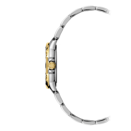 The Raymond Weil Tango is powered by a quartz movement in a 30mm stainless steel case with yellow gold-plated bezel. The white dial showcases a date display and is protected by sapphire crystal. The stainless steel and yellow gold PVD plated bracelet includes a deployant clasp. Water resistant to 100 meters.