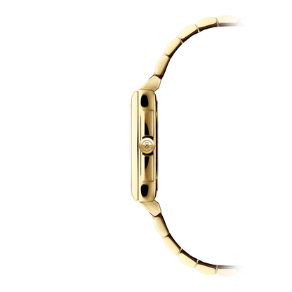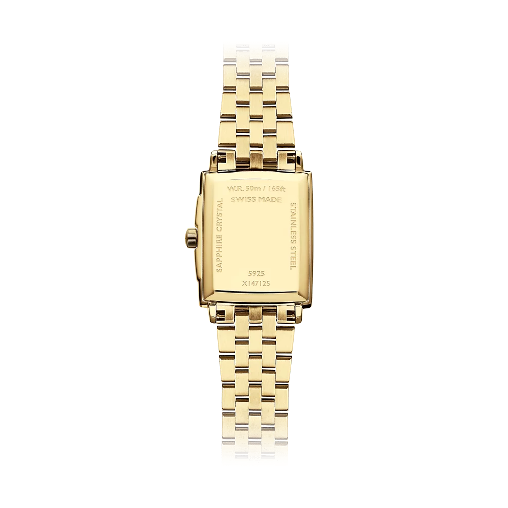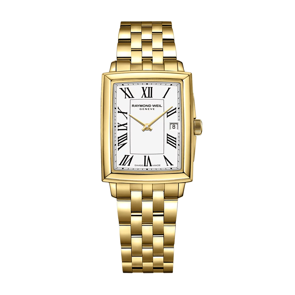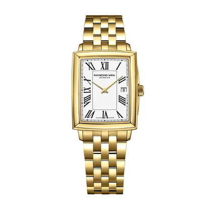 The Raymond Weil Toccata runs on a quartz movement inside of a 22.60 by 28.10mm yellow gold PVD-plated steel case. The white dial has Roman numerals and a date display. It is protected by sapphire crystal. The yellow gold PVD-plated steel bracelet has a folding clasp with a double-push security system. Water resistant to 50 meters.