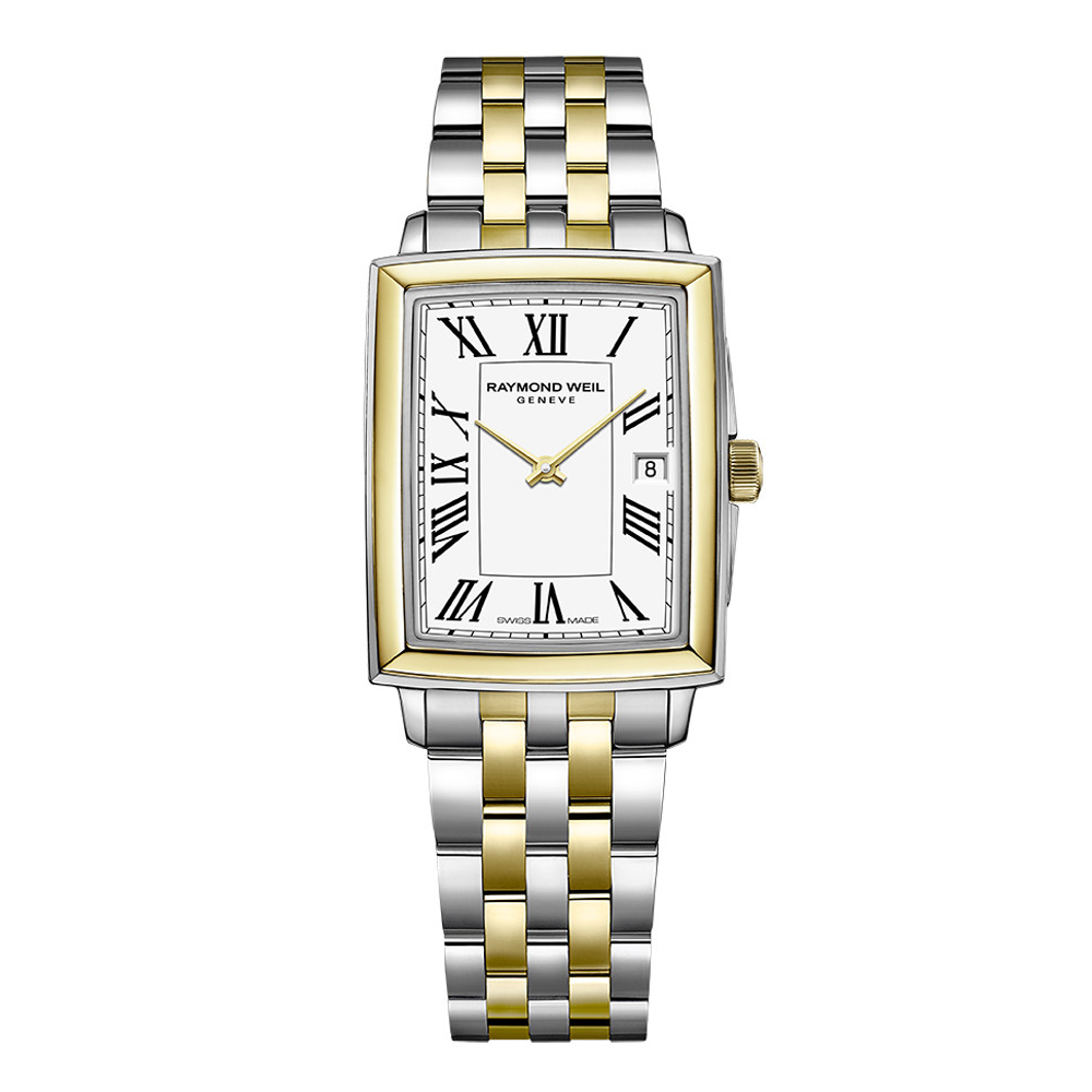 This Raymond Weil Toccata has a quartz movement contained in a 25mm x 35mm stainless steel and yellow gold PVD plated case. The white dial reveals a date display. It is covered by sapphire crystal. The stainless steel and yellow gold PVD plated bracelet has a deployant clasp. Water resistant to 50 meters.