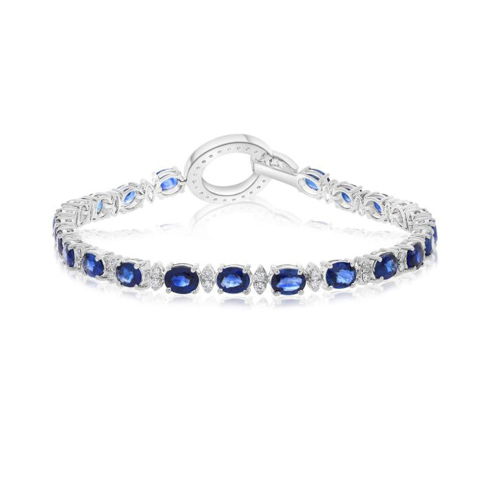 This Roman and Jules blue sapphire and diamond bracelet is crafted in 14K white gold. The bracelet showcases 6.75 carats of oval blue sapphires alternating with marquise diamonds. It is secured by a circular clasp set with additional diamonds. This bracelet has a total diamond weight of 0.71 carats.