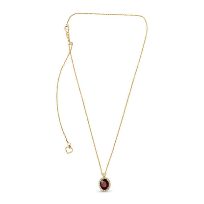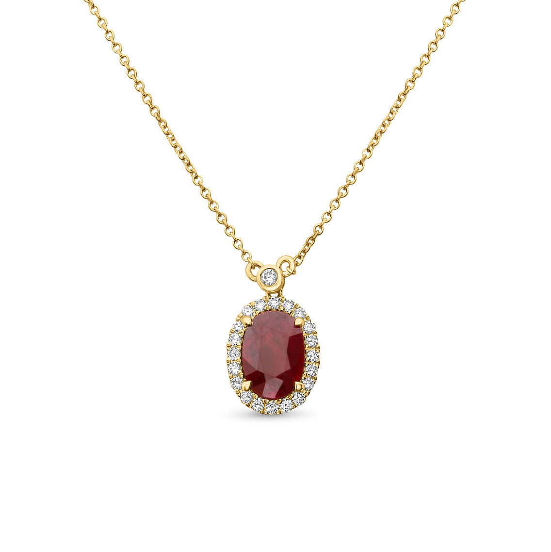 This ruby pendant showcases a 1.64 carat oval-cut ruby center stone encircled by a halo of round brilliant-cut diamonds totaling 0.23 carats set in 14K yellow gold and suspended from a delicate yellow gold chain. A single bezel-set diamond adds a subtle accent to the bail.