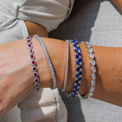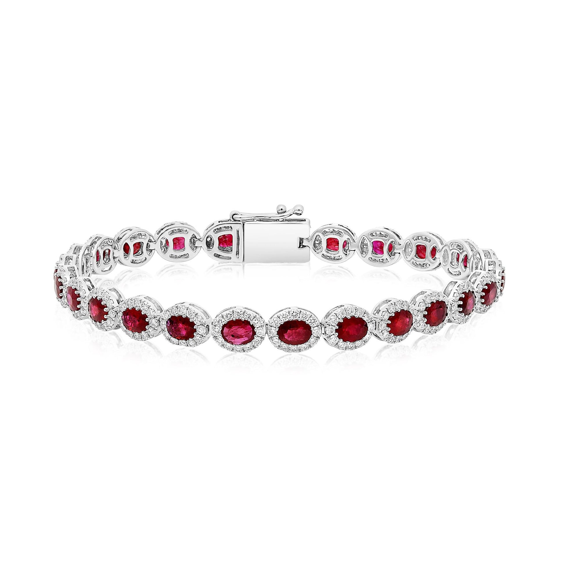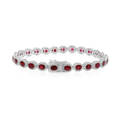 This Roman and Jules ruby bracelet is fashioned in 14K white gold. The bracelet is set with 6 carats of red ruby gemstones accented by diamond halos totaling 2.25 carats.